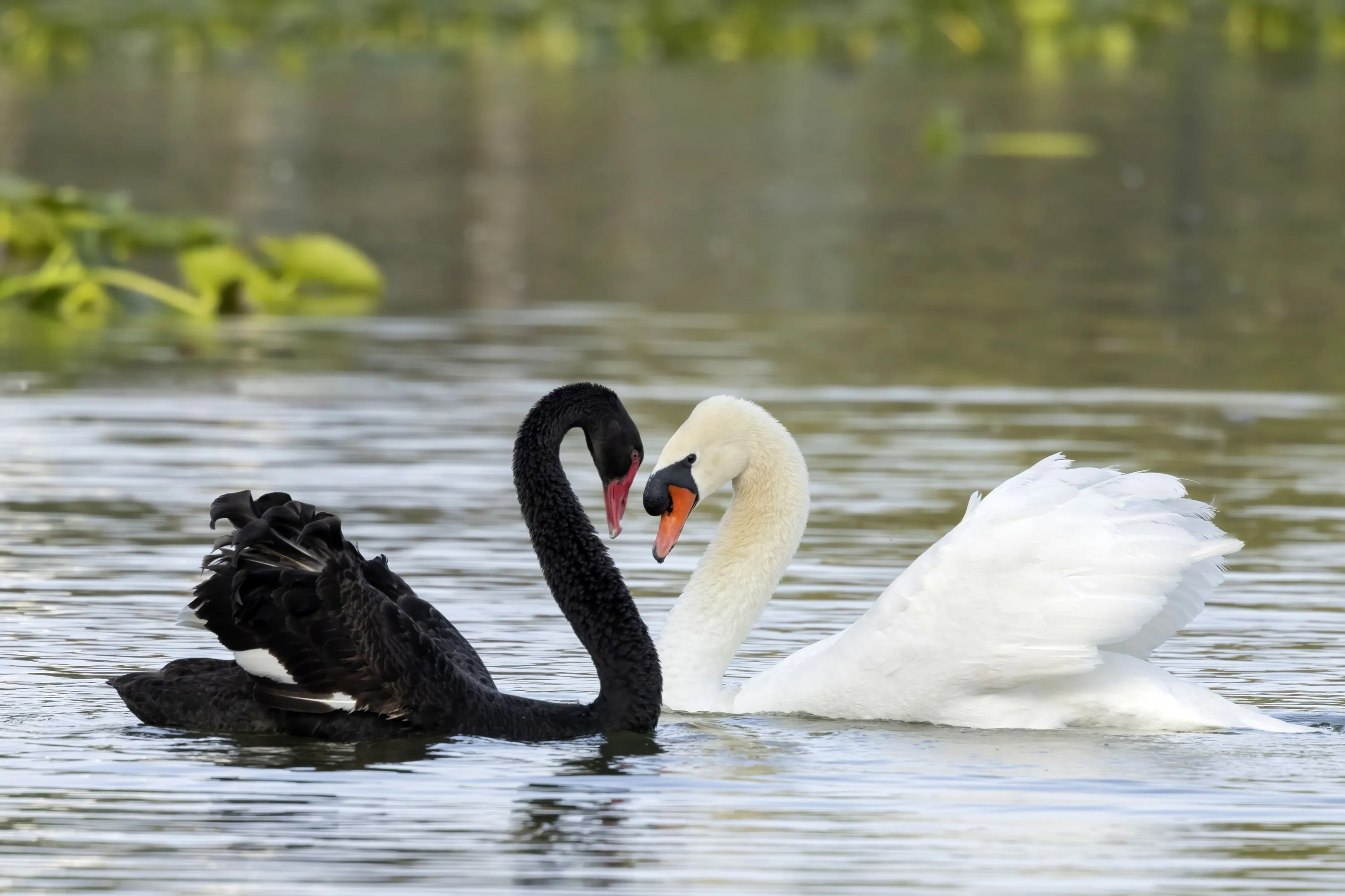 Yin and yang swans were spotted flirting with each other in Lakeland, Florida in the first decade of April 2024. Swans once disappeared from Lakeland in 1954, the last one falling victim to an alligator attack. To bring the birds back to the place, a pair of White Mute swans were shipped from England and released in Lake Morton in 1957. Descendants of that pair continue to grace the city's many lakes. (Photo by Media Drum Images)