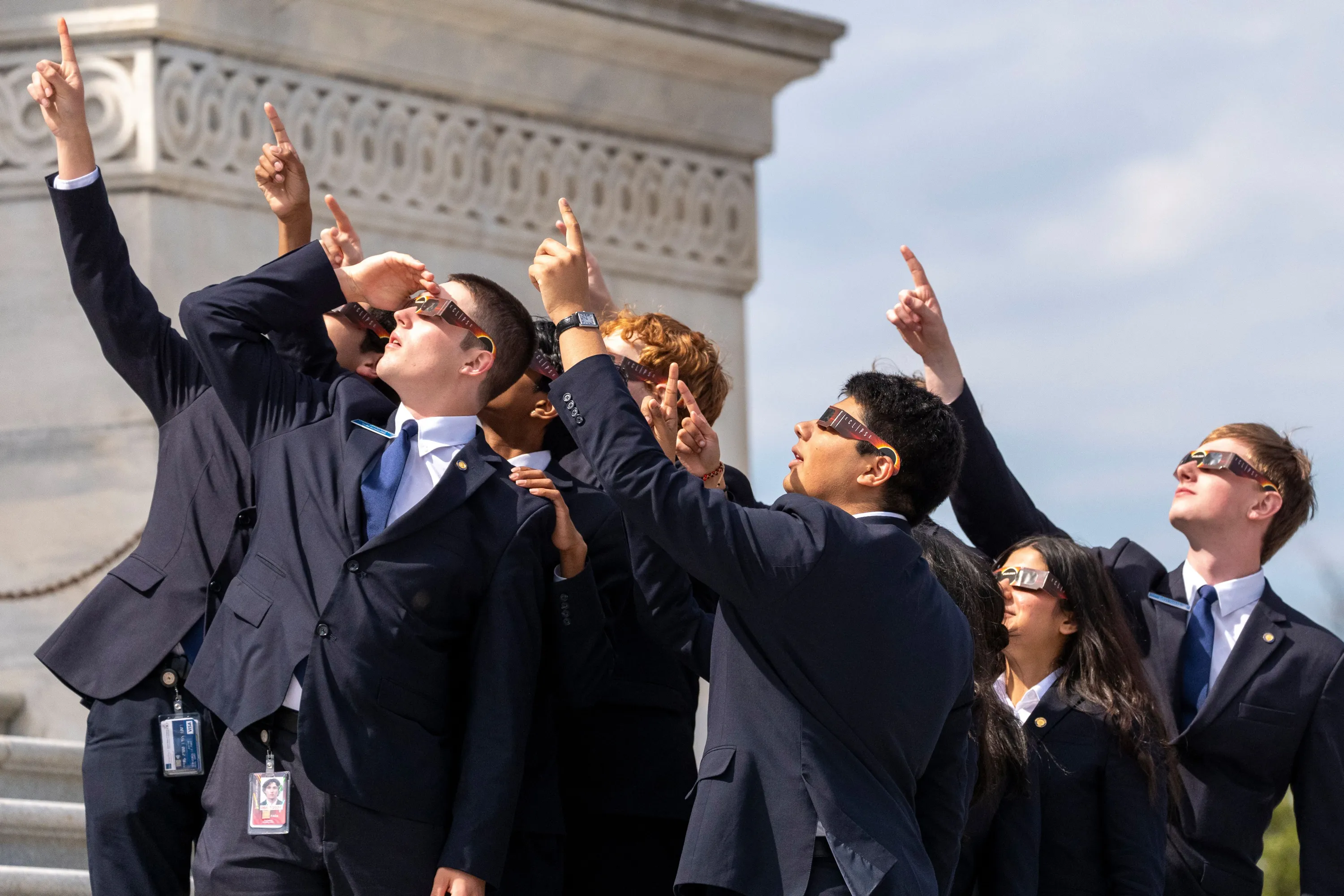 Senate pages wear eclipse glasses as they view the moon partially covering the sun during a total solar eclipse, in front of the U.S. Senate on Capitol Hill, Monday, April 8, 2024, in Washington. (Photo by Alex Brandon/AP Photo)