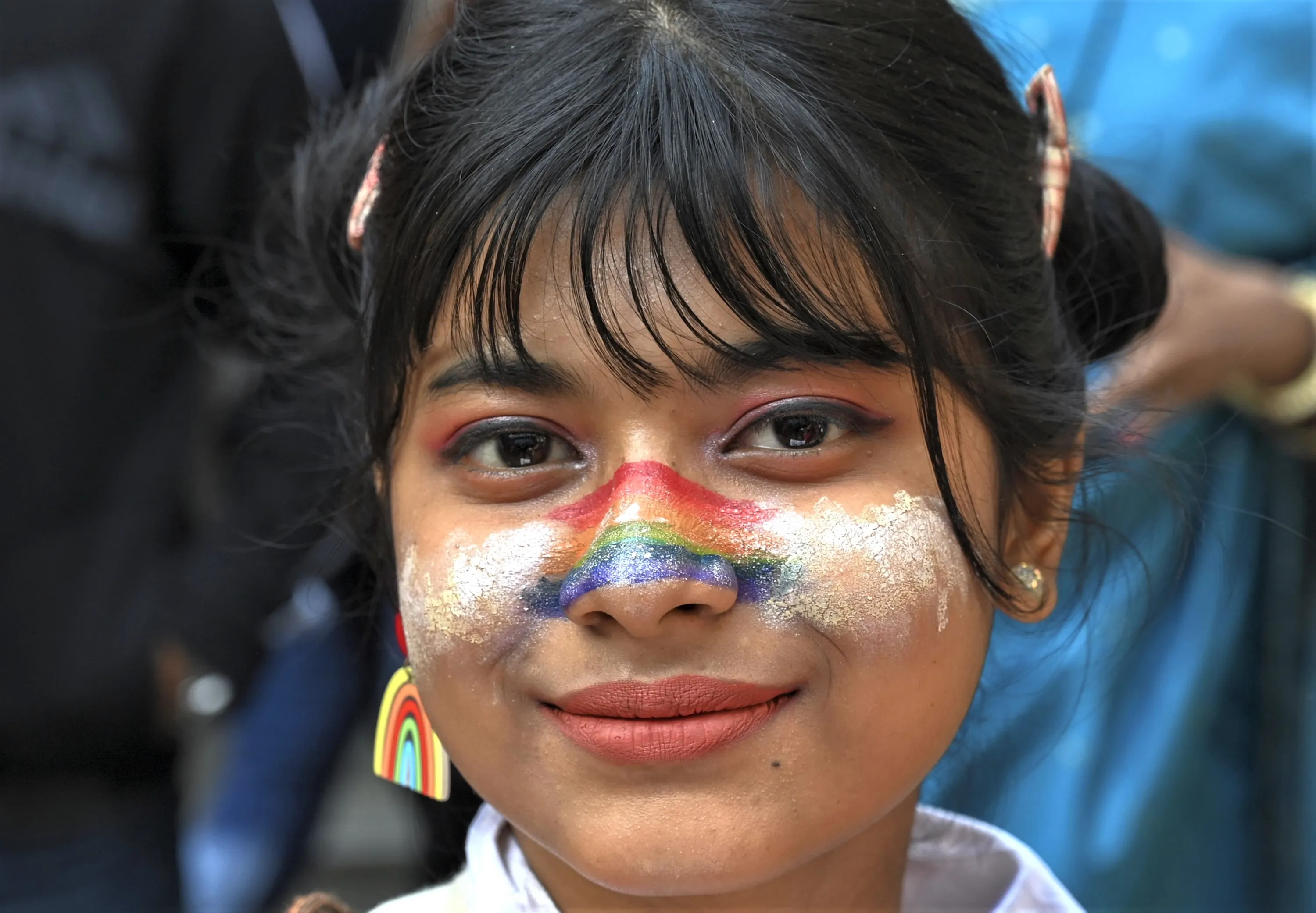 A participant has rainbow colors smeared on the face as members of the LGBTQ community and their supporters march demanding equal marriage rights in New Delhi, India, Sunday, January 8 2023. The government is yet to legalize same-sex marriages in the country even though the Supreme Court in 2018 struck down a colonial-era law that made gay sex punishable by up to 10 years in prison. (Photo by AP Photo/Stringer)