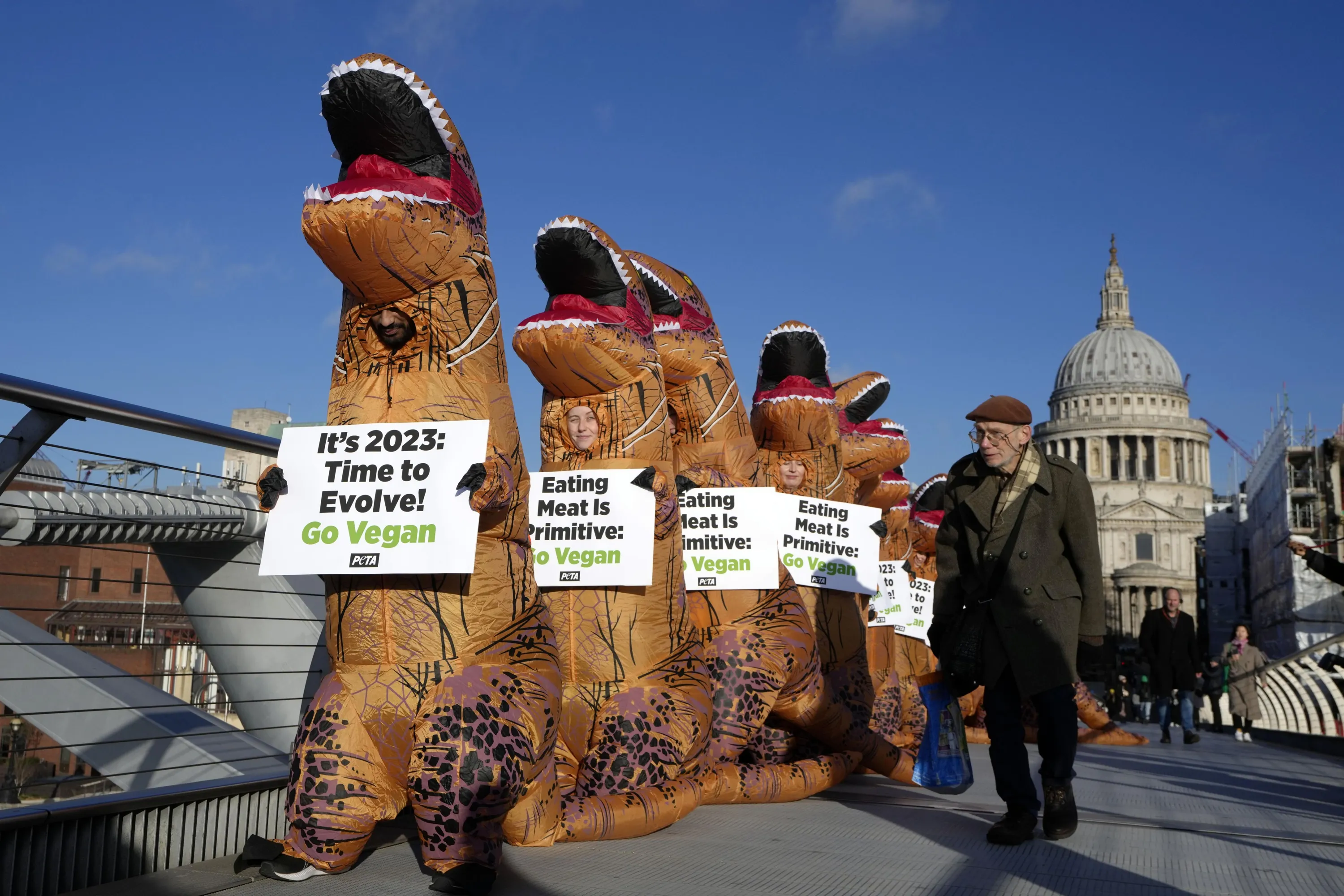 Passers by look towards PETA (People for the Ethical Treatment of Animals) supporters dressed in dinosaur costumes with the message: consuming meat, eggs, and dairy is primitive, walk over Millennium Bridge in London, Wednesday, January 18, 2023. Veganuary is an annual global campaign that promotes going vegan for the month of January to help animals, slash greenhouse gas emissions, and improve one's personal health. (Photo by Kirsty Wigglesworth/AP Photo)