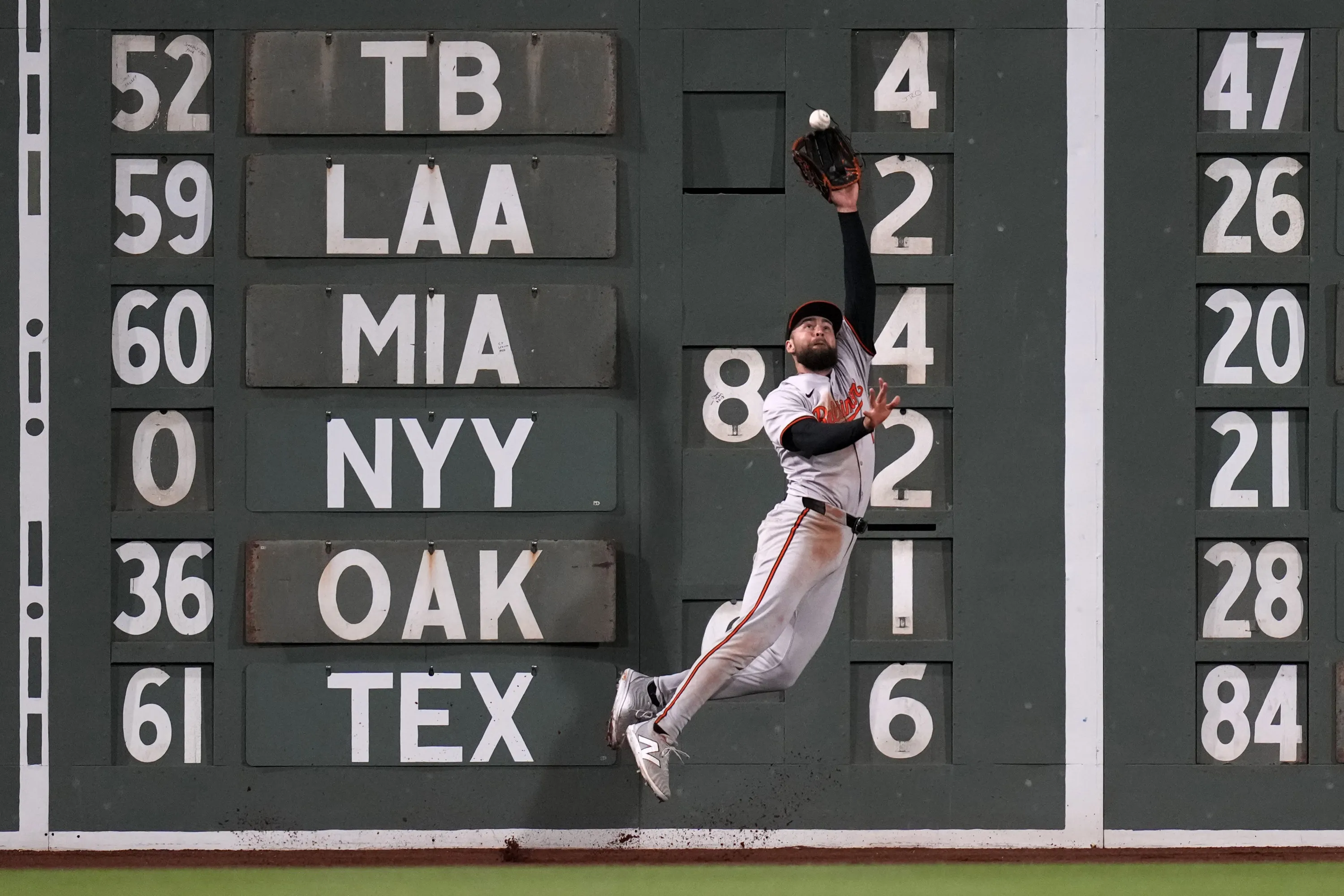 Baltimore Orioles outfielder Colton Cowser makes the catch on a fly out by Boston Red Sox's Romy Gonzalez during the eighth inning of a baseball game, Wednesday, April 10, 2024, in Boston. (Photo by Charles Krupa/AP Photo)