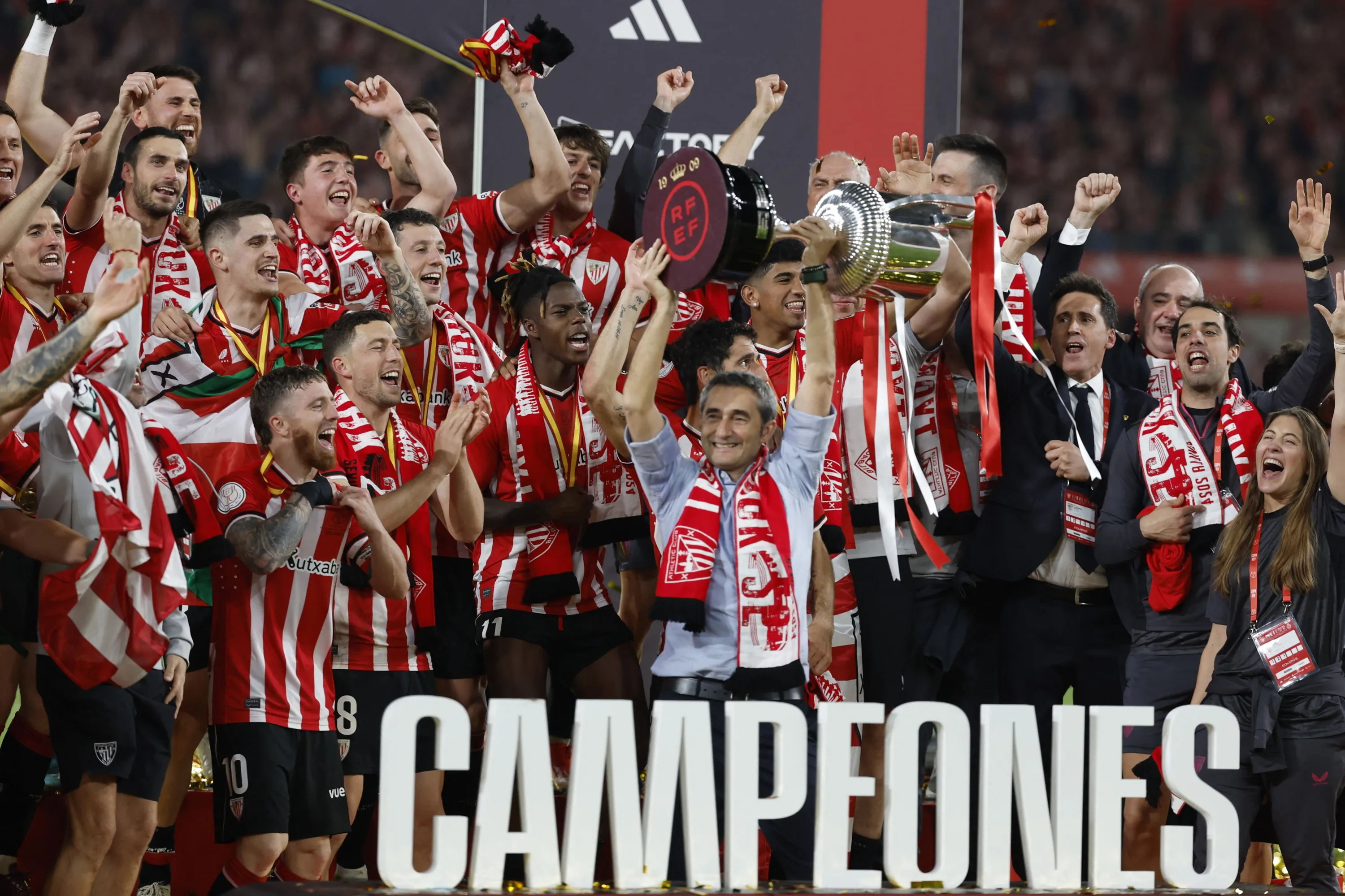Athletic Bilbao's Spanish coach Ernesto Valverde holds the Copa del Rey trophy at the end of the Spanish Copa del Rey (King's Cup) final football match between Athletic Club Bilbao and RCD Mallorca at La Cartuja stadium in Seville on April 6, 2024. (Photo by Jaime Reina/AFP Photo)