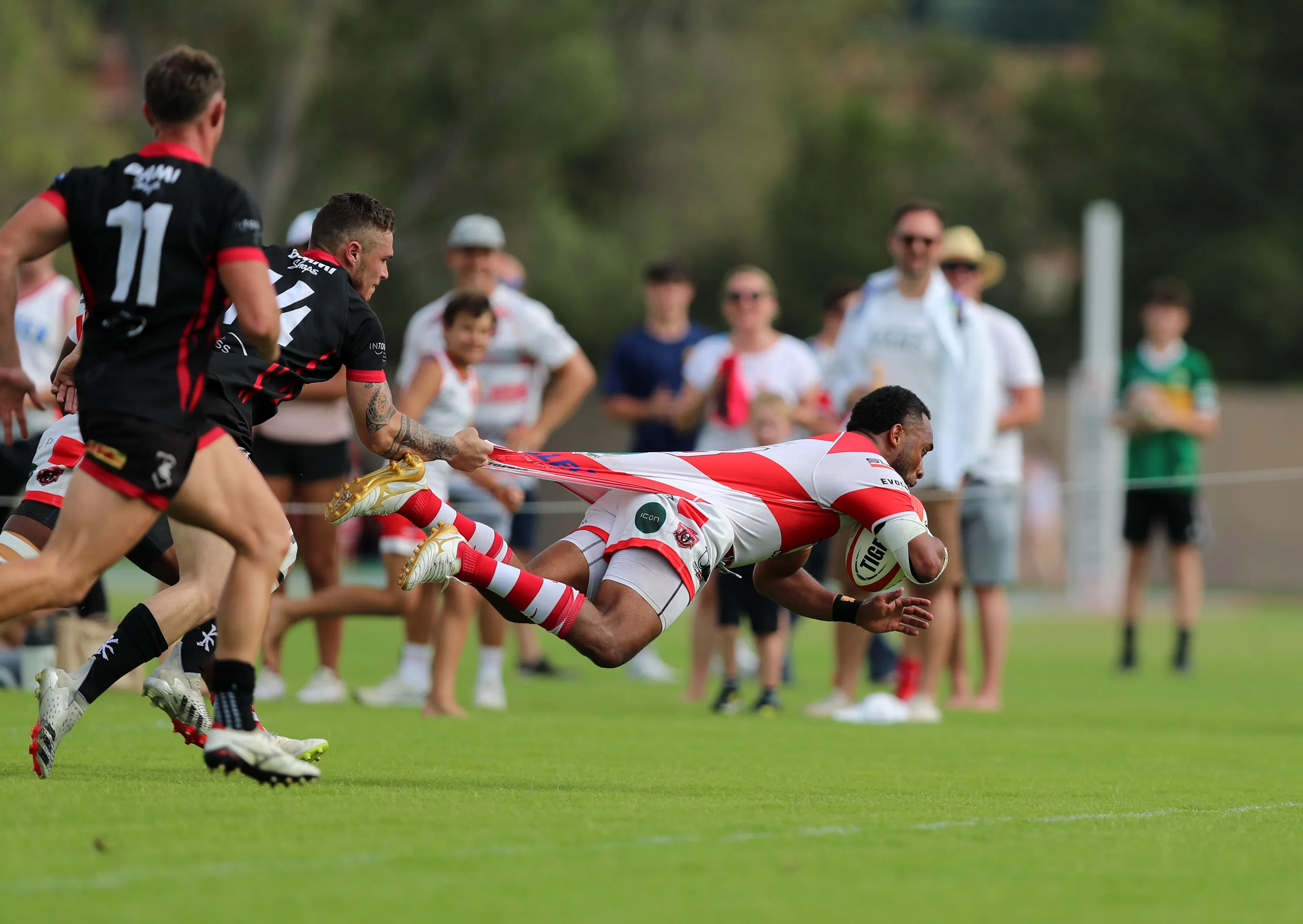 Tigers' Sakiusa Naisau scores. West Asia Premiership Final, Dubai Tigers v Bahrain. Tigers Park, Dubai on April 13, 2024. (Photo by Chris Whiteoak/The National)