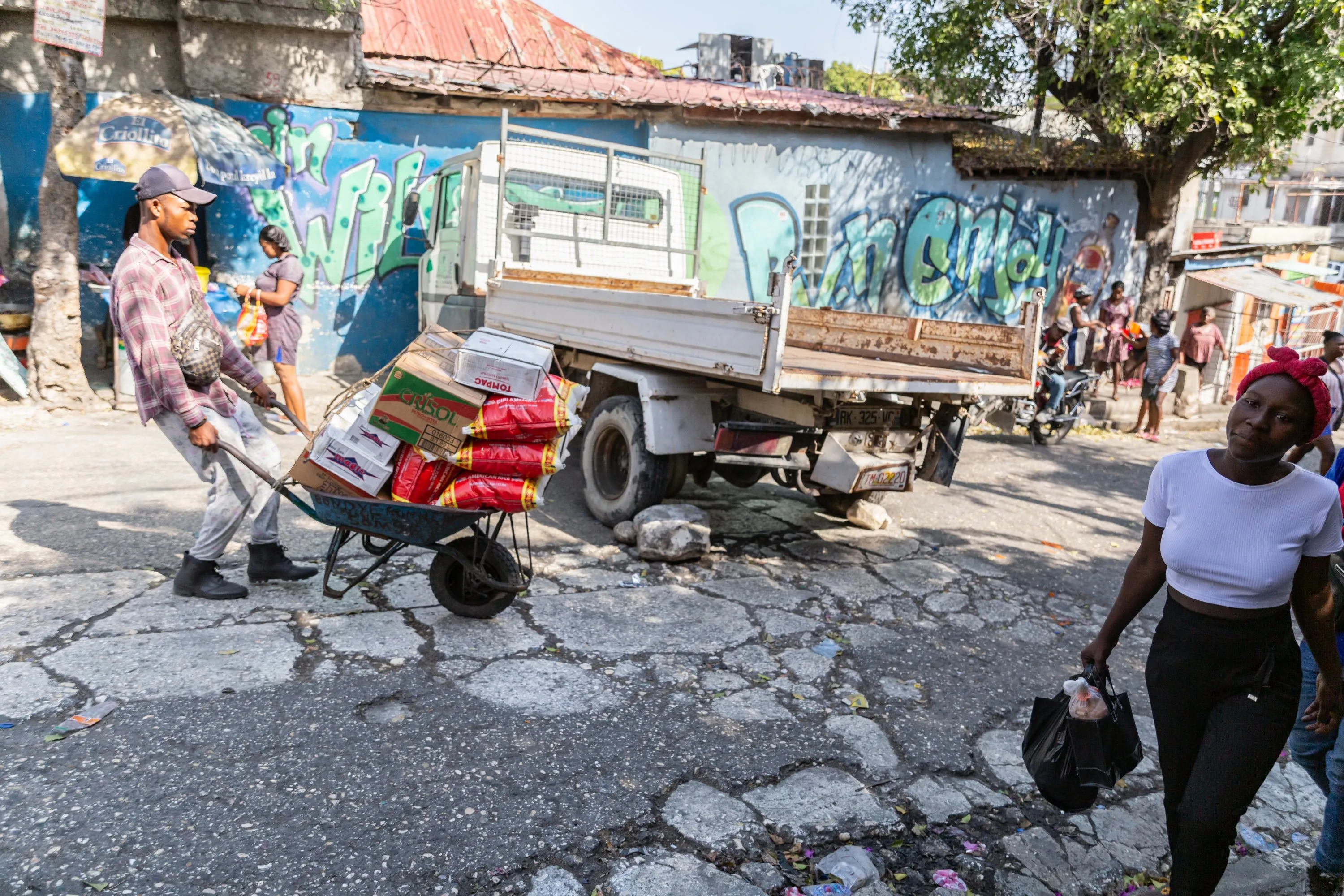 A man pushes a wheelbarrow of food supplies down the street in petion-ville, amid the ongoing insecurity and political instability in Port-au-Prince, Haiti, March 21, 2024. (Photo by Guerinault Louis/Anadolu via Getty Images)