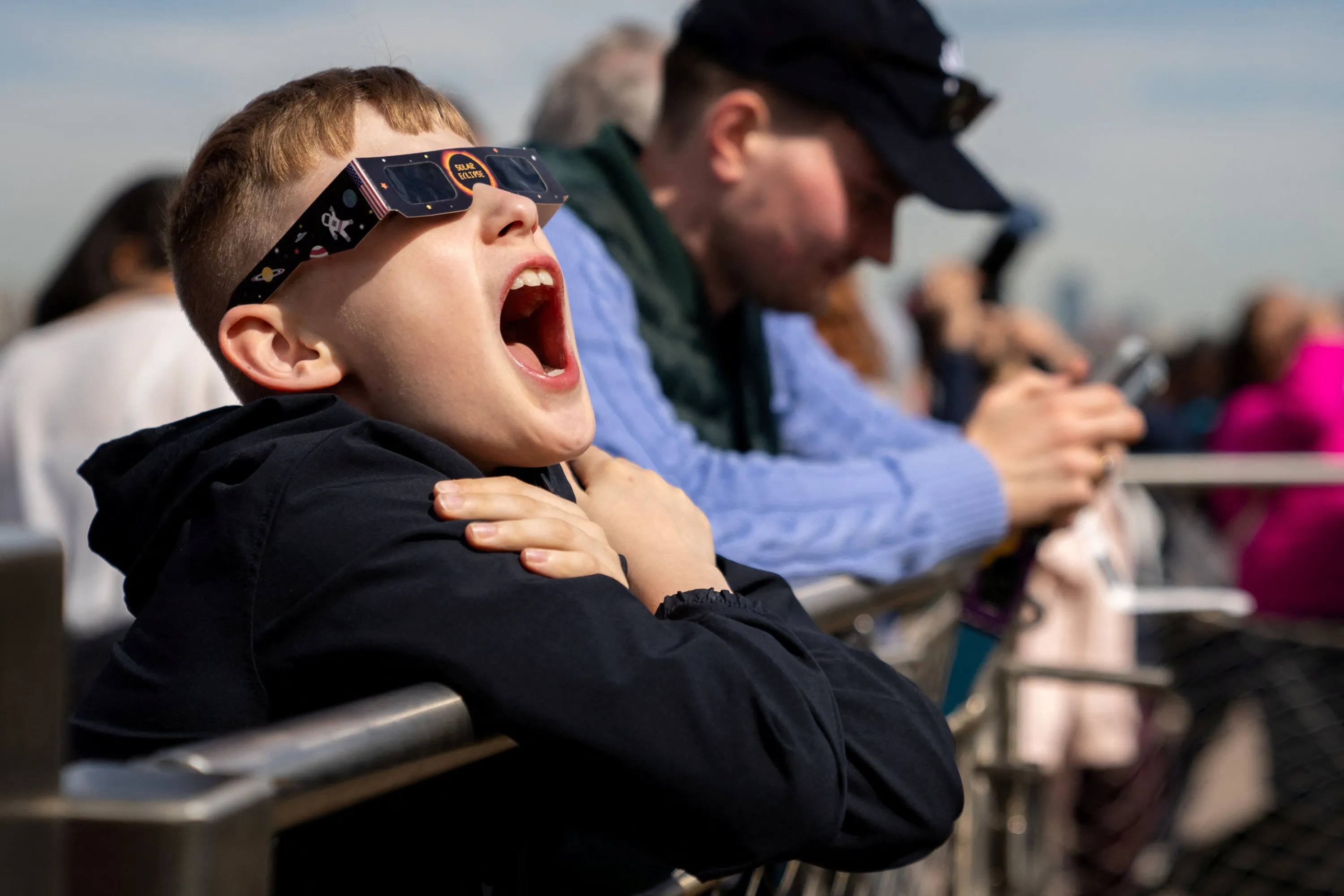 People watch the partial solar eclipse at Liberty Island in New York City, on April 8, 2024. (Photo by David Dee Delgado/Reuters)
