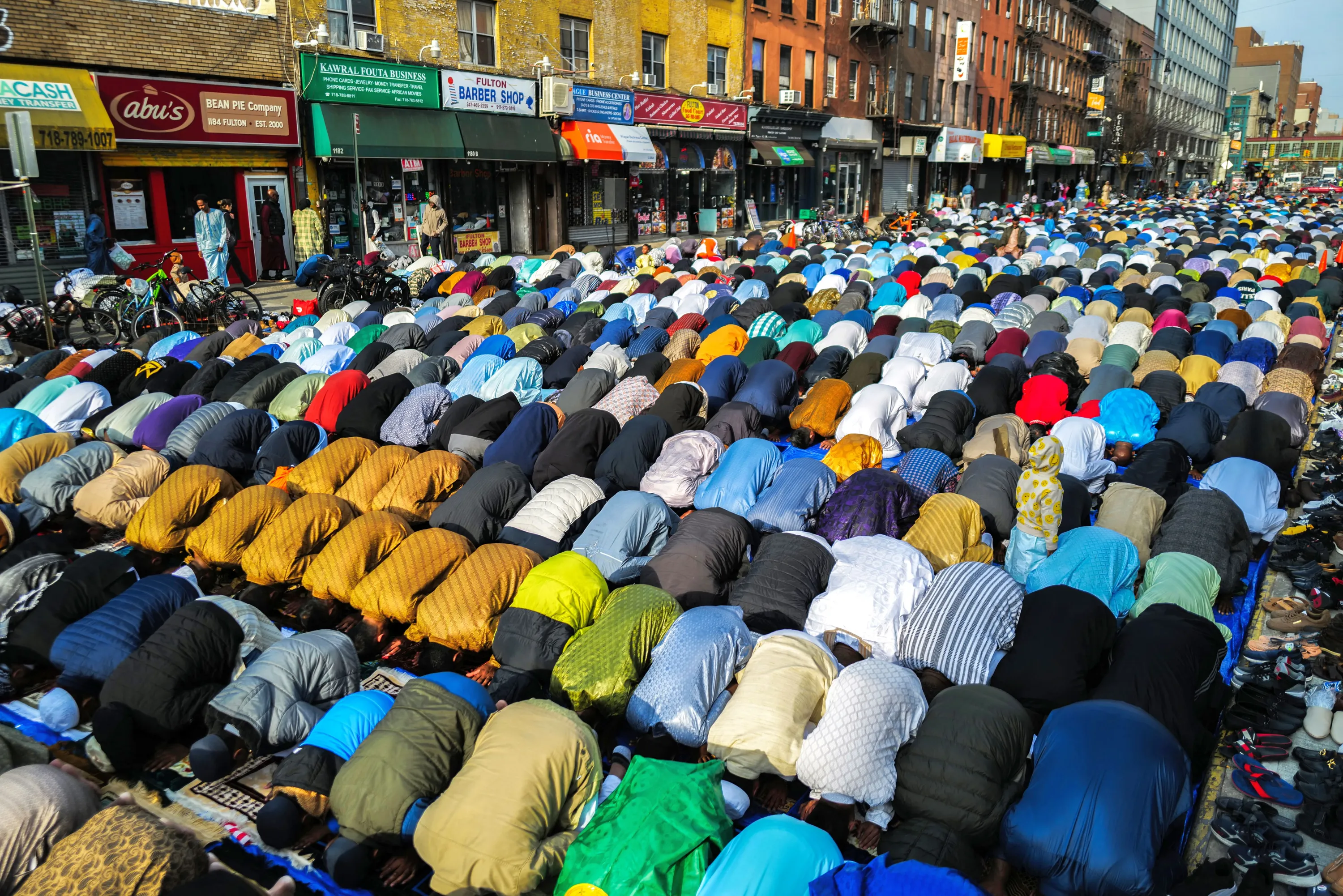 Members of the Muslim community attend prayers outside the Masjid At Taqwa Miosque during Eid al-Fitr celebrations in the Brooklyn borough of New York on April 10, 2024. (Photo by Charly Triballeau/AFP Photo)