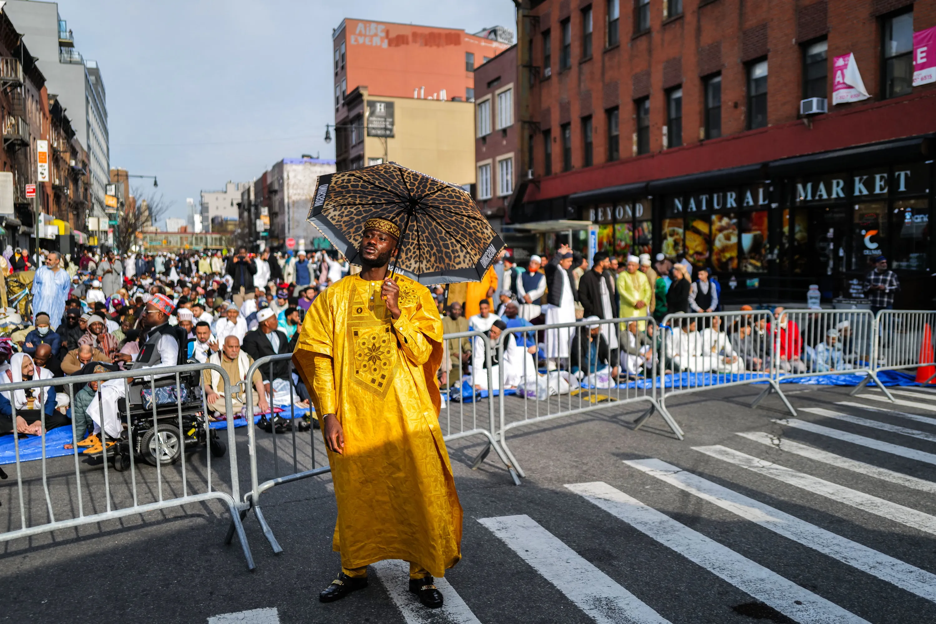Members of the Muslim community attend prayers outside the Masjid At Taqwa Miosque during Eid al-Fitr celebrations in the Brooklyn borough of New York on April 10, 2024. (Photo by Charly Triballeau/AFP Photo)