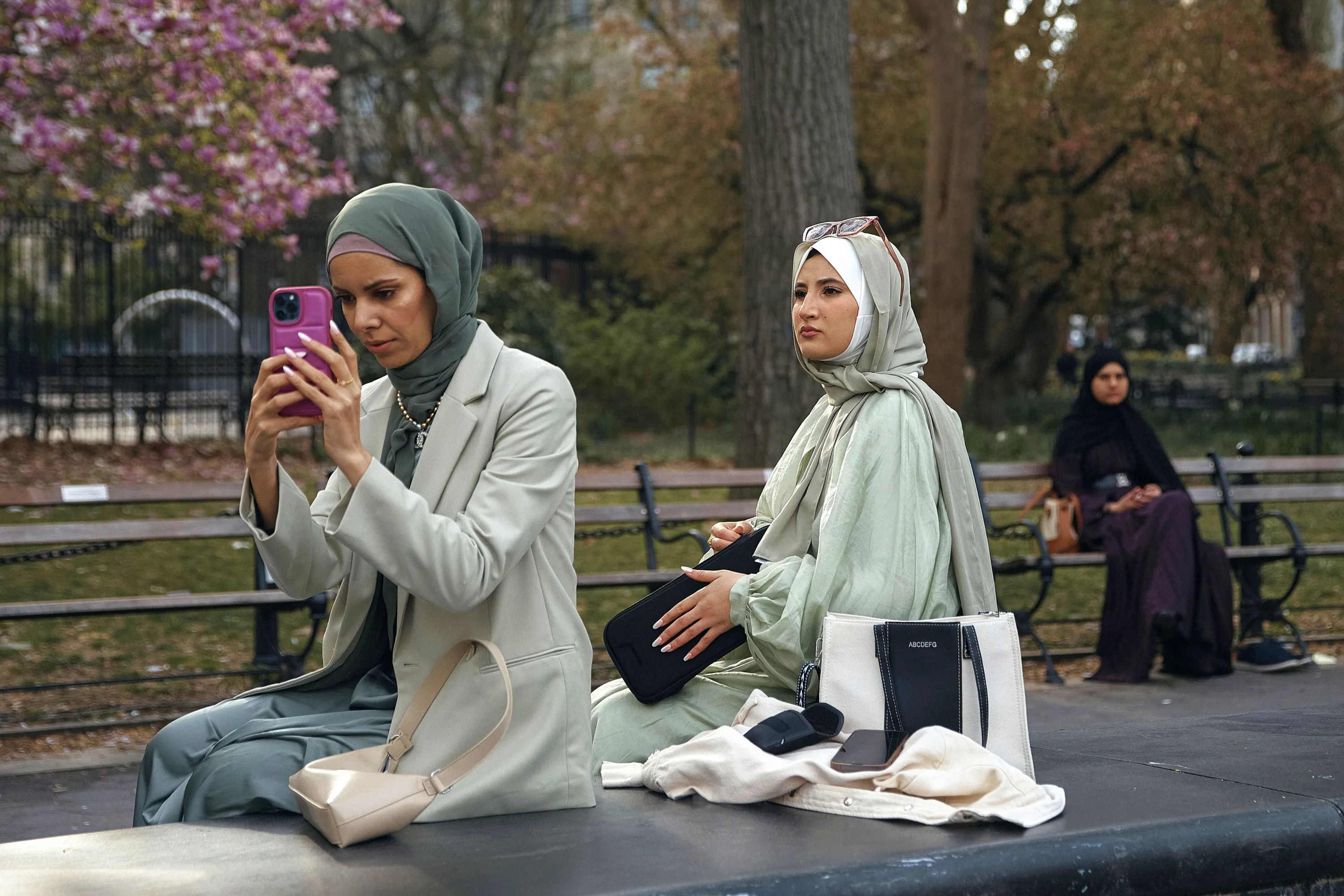 Muslims hang out during an Eid al-Fitr prayer, marking the end of the fasting month of Ramadan at Washington Square Park on Wednesday, April 10, 2024, in New York. (Photo by Andres Kudacki/AP Photo)