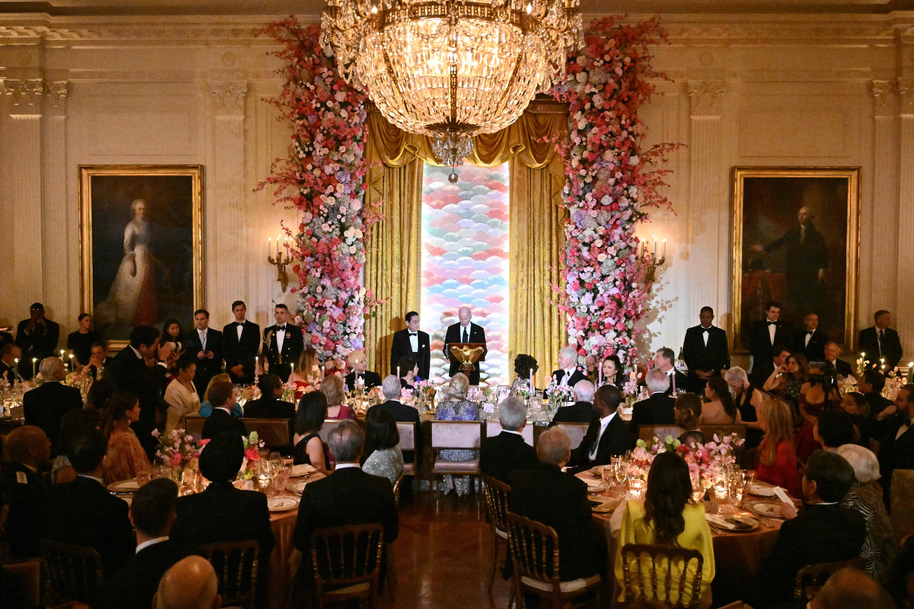 US President Joe Biden speaks, flanked by Japanese Prime Minister Fumio Kishida, during a State Dinner in the East Room of the White House in Washington, DC, April 10, 2024. (Photo by Mandel Ngan/AFP Photo)
