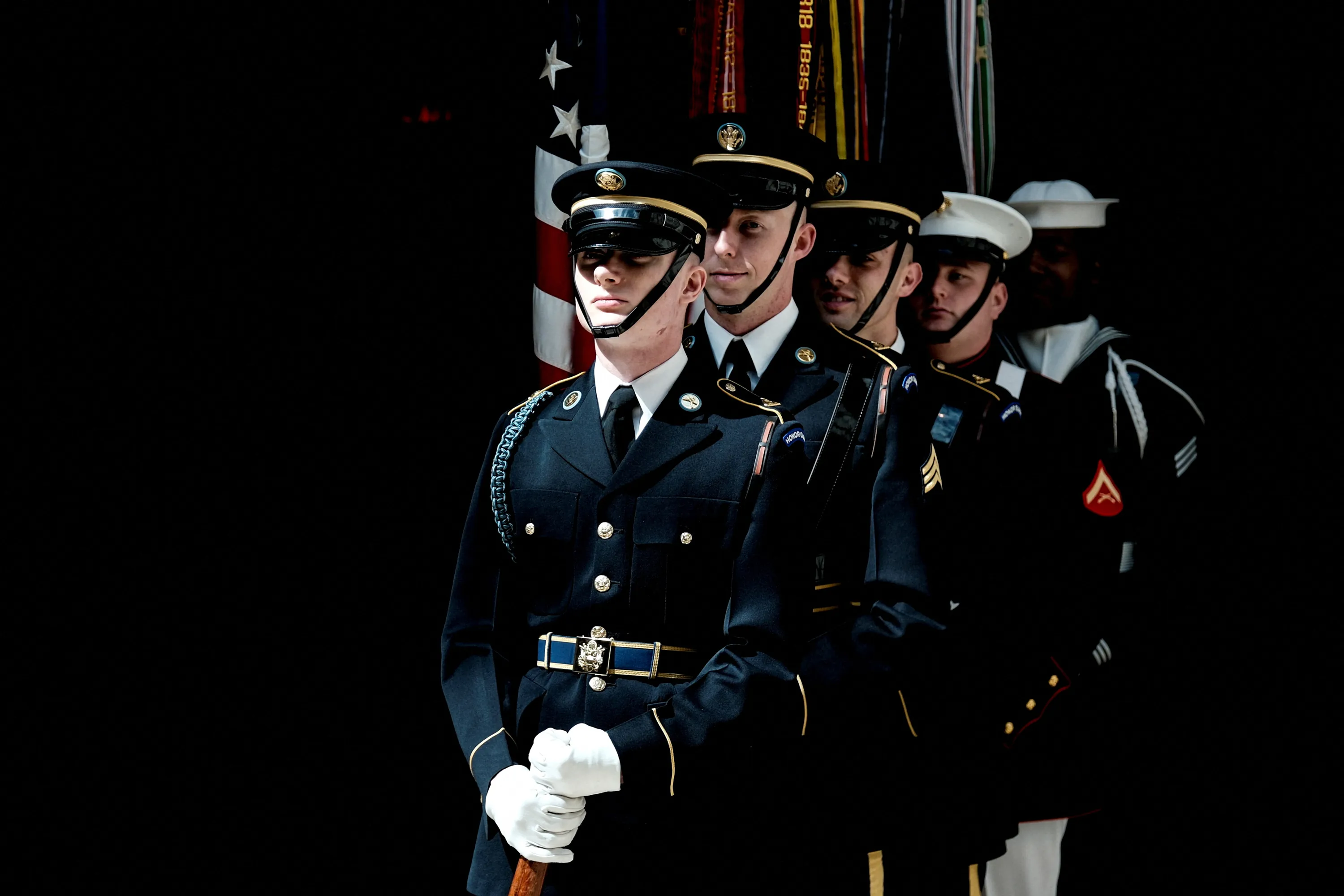 Members of the U.S. Military Color guard participate in a Congressional Gold Medal Ceremony honoring the “Rosies” – women such as 'Rosie the Riveter' who held jobs or volunteered in support of the war effort during World War II, in Emancipation Hall of the U.S. Capitol in Washington on April 10, 2024. (Photo by Michael A. McCoy/Reuters)