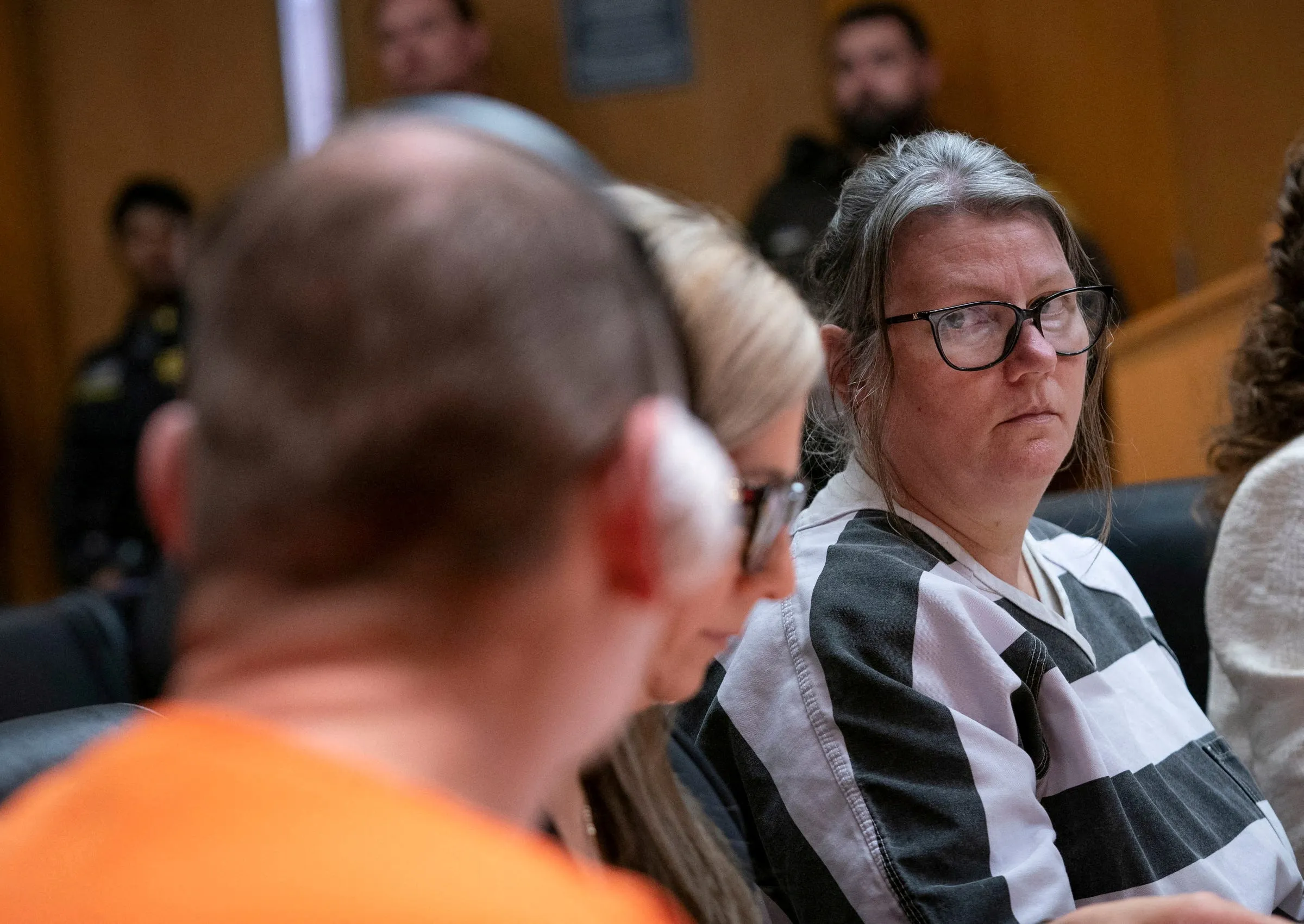 Jennifer Crumbley glances at her husband James Crumbley during their sentencing hearing in an Oakland County courtroom in Pontiac, Michigan, U.S. April 9, 2024. The Crumbleys are the mother and father of a Michigan teen who shot and killed four classmates, and were each sentenced to between 10 and 15 years in prison after a jury convicted them of manslaughter in a rare case of parents being held responsible in a school shooting. (Photo by Mandi Wright/USA Today Network via Reuters)