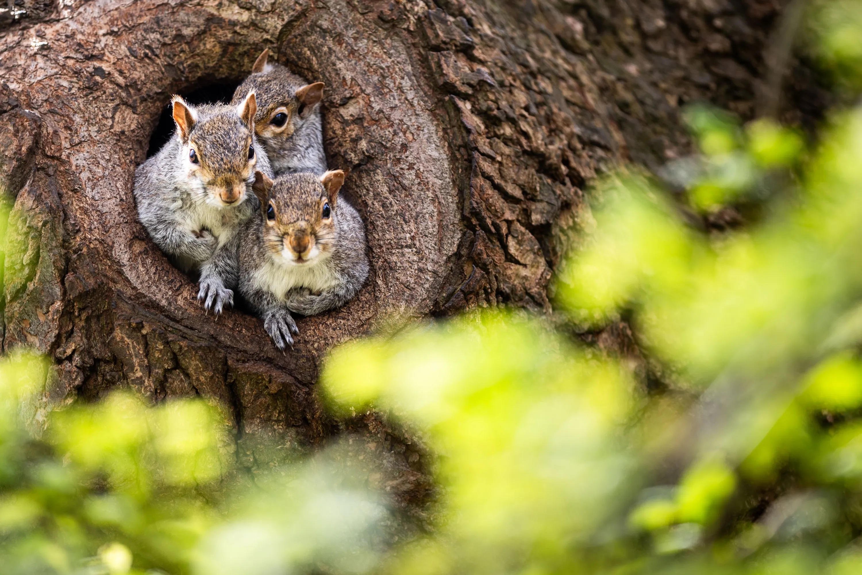 A hungry squirrel tries to protect his nuts from being squashed as two mates join him in their den in a tree trunk in the first decade of April 2024. The grey squirrels have made a home in the knot in the oak tree next to Christchurch Priory, Dorset, UK. The gap in the trunk is only about 8ins in diameter and it proved a squash and a squeeze when three furry mammals tried to all get out at the same time. (Photo by Snap Photography/Bournemouth News)