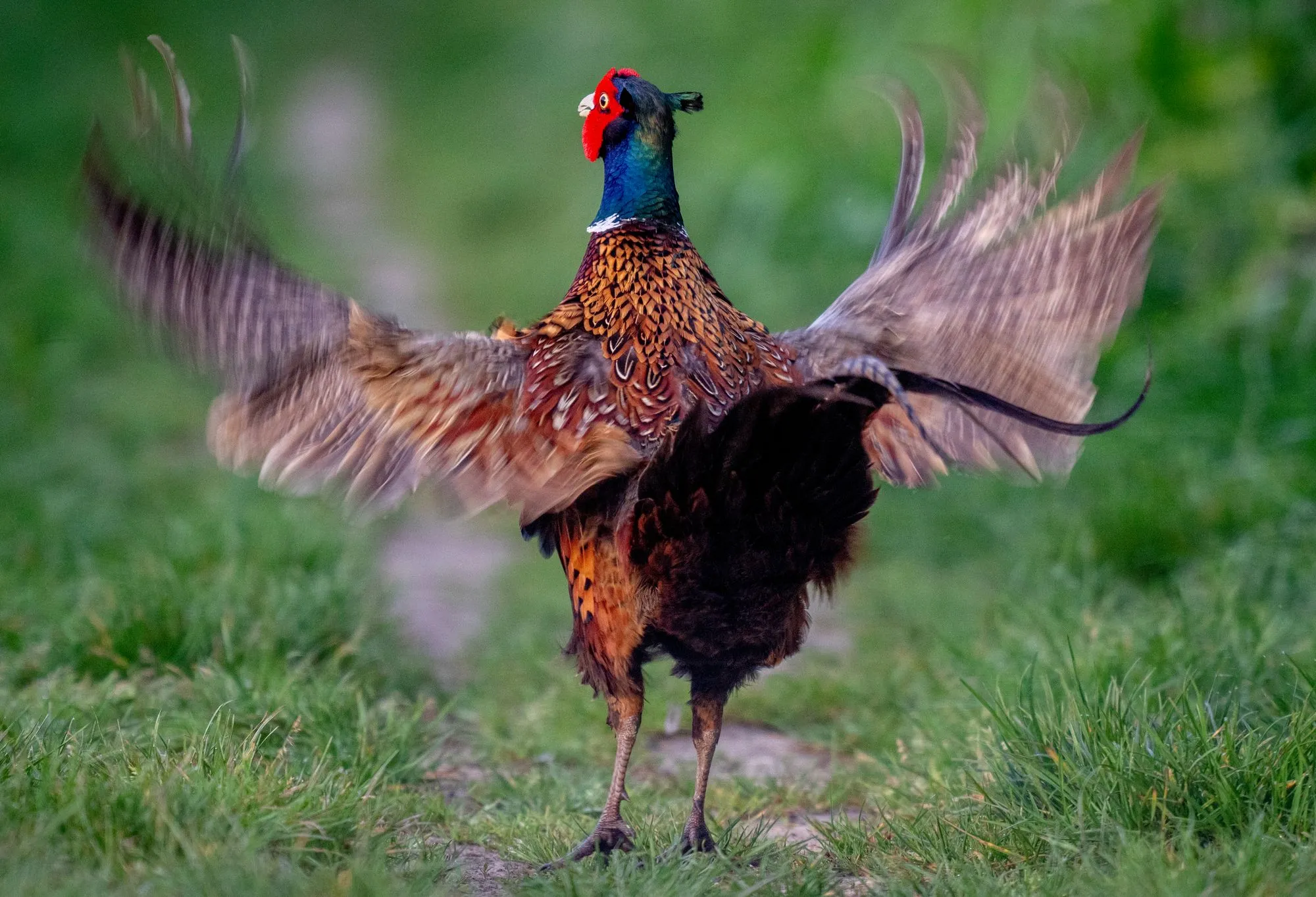 A pheasant moves its wings on a meadow in the outskirts of Frankfurt, Germany, Wednesday, April 10, 2024. (Photo by Michael Probst/AP Photo)