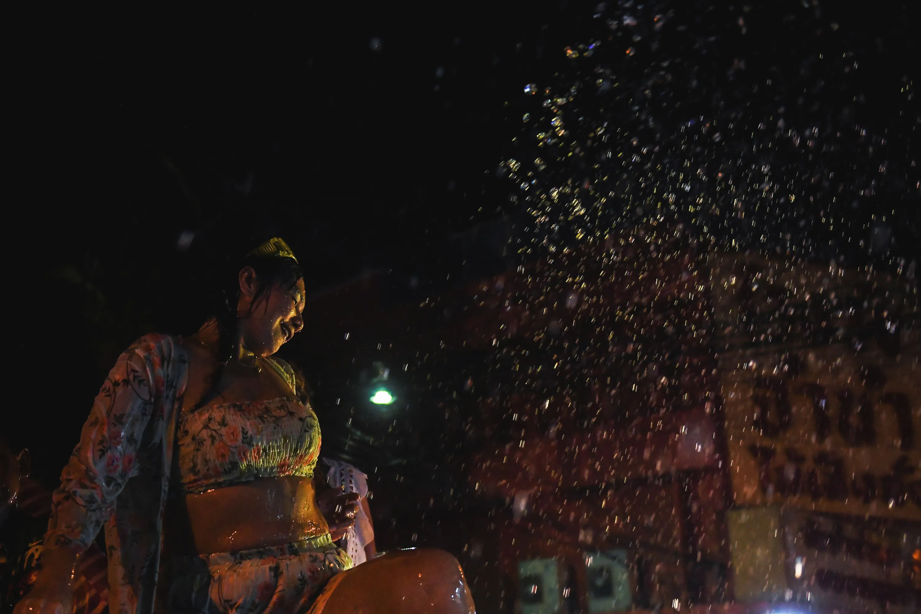A woman plays with water as she celebrates the Songkran holiday which marks the Thai New Year in Bangkok, Thailand, on April 14, 2023. (Photo by Chalinee Thirasupa/Reuters)