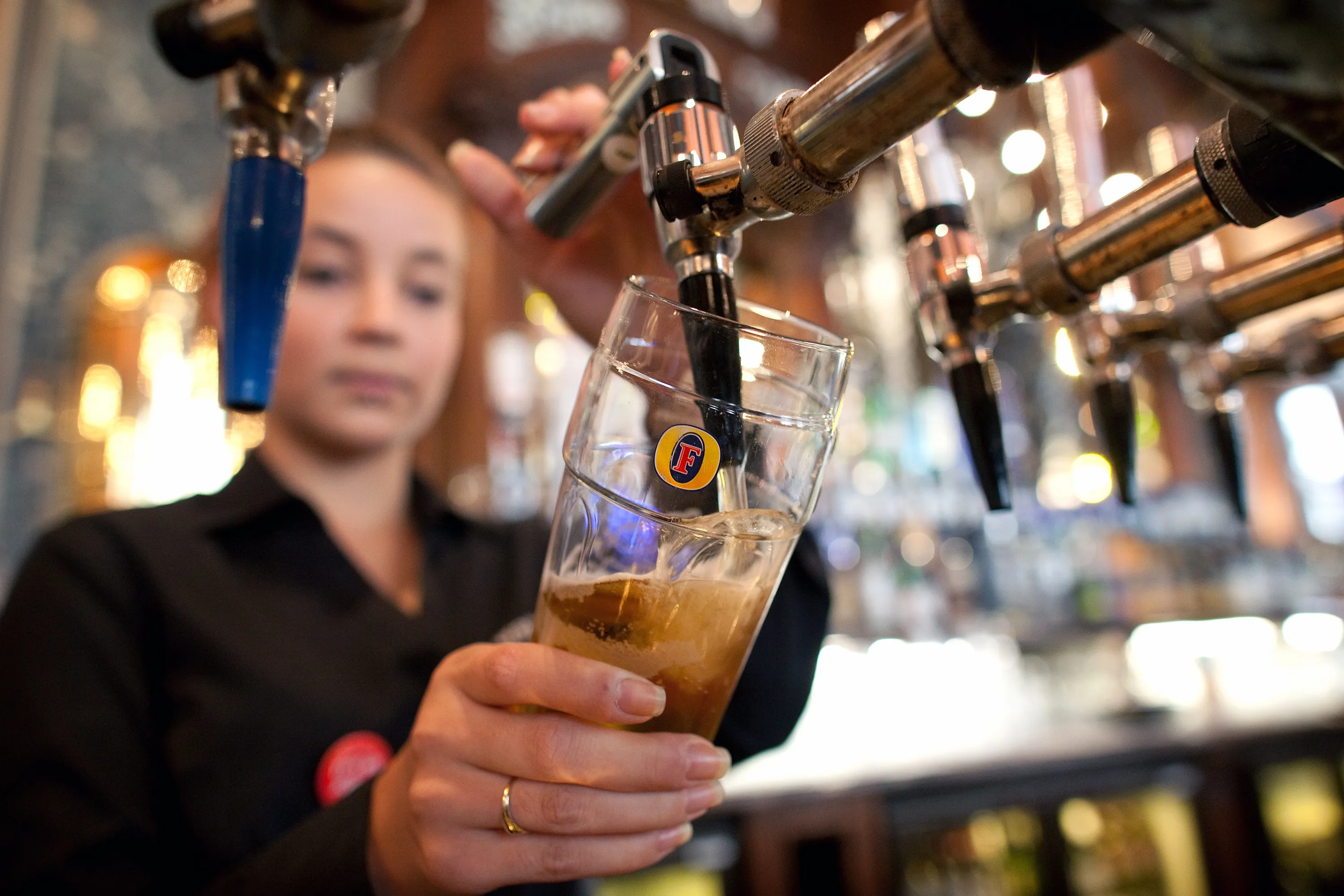 A bartender pours a pint of Fosters lager at The Knights Templar public house, operated by JD Wetherspoon Plc, in London, U.K., on Wednesday, September 7, 2011. (Photo by Simon Dawson/Bloomberg via Getty Images)