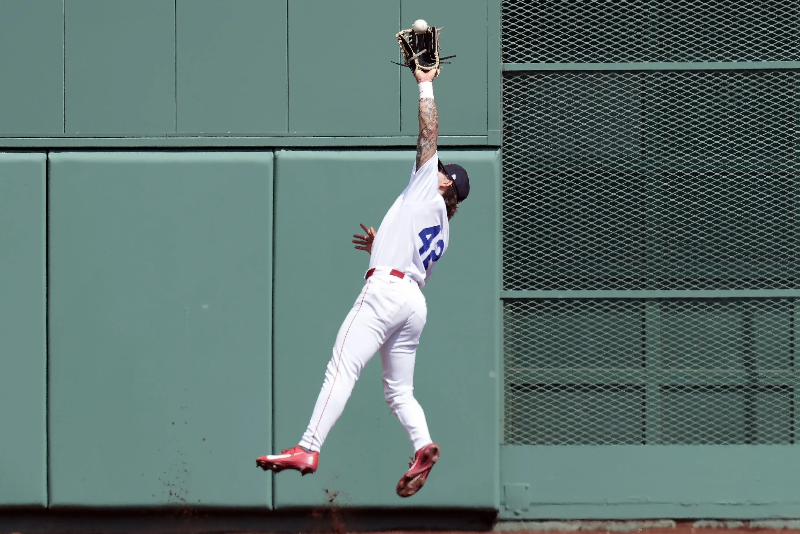 Boston Red Sox's Jarren Duran makes the catch on the fly out by Cleveland Guardians' Andrés Giménez during the fourth inning of a baseball game, Monday, April 15, 2024, in Boston. (Photo by Michael Dwyer/AP Photo)