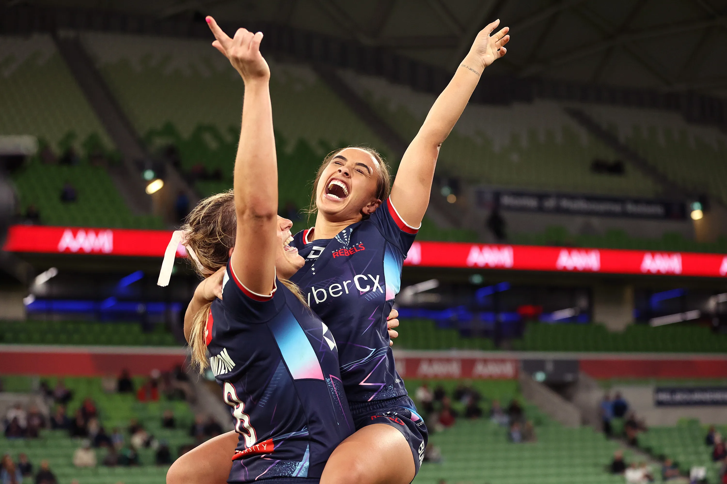 Chanelle Kohika-Skipper of the Rebels and Grace Hamilton of the Rebels celebrate winning during the round five Super Rugby Women's match between Melbourne Rebels and Fijian Drua at AAMI Park on April 13, 2024 in Melbourne, Australia. (Photo by Kelly Defina/Getty Images)