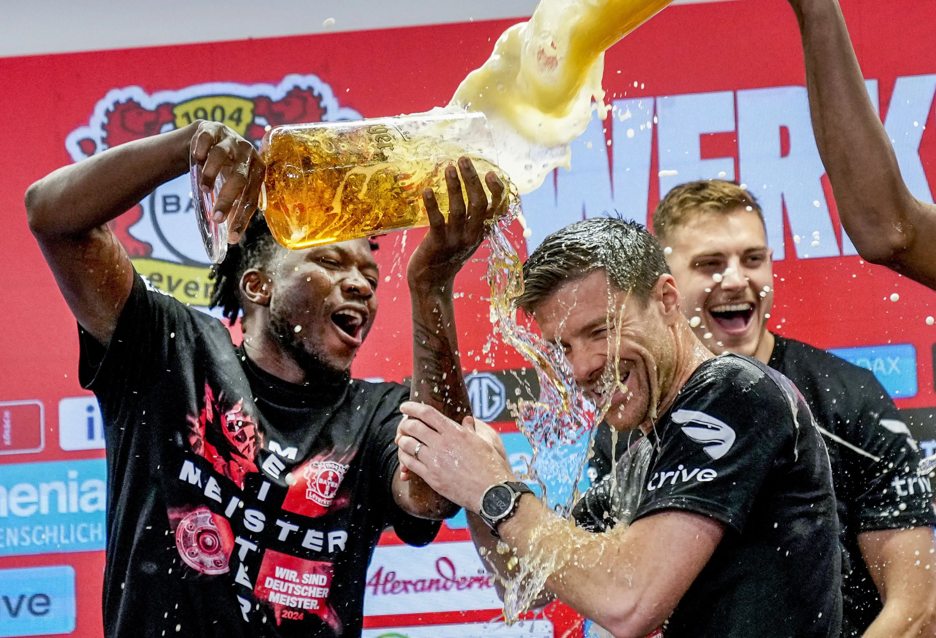 Leverkusen's head coach Xabi Alonso , centre, is sprayed with beer after Bayer Leverkusen won the German Bundesliga title beating Werder Bremen in Leverkusen, Germany, Sunday, April 14, 2024. (Photo by Martin Meissner/AP Photo)
