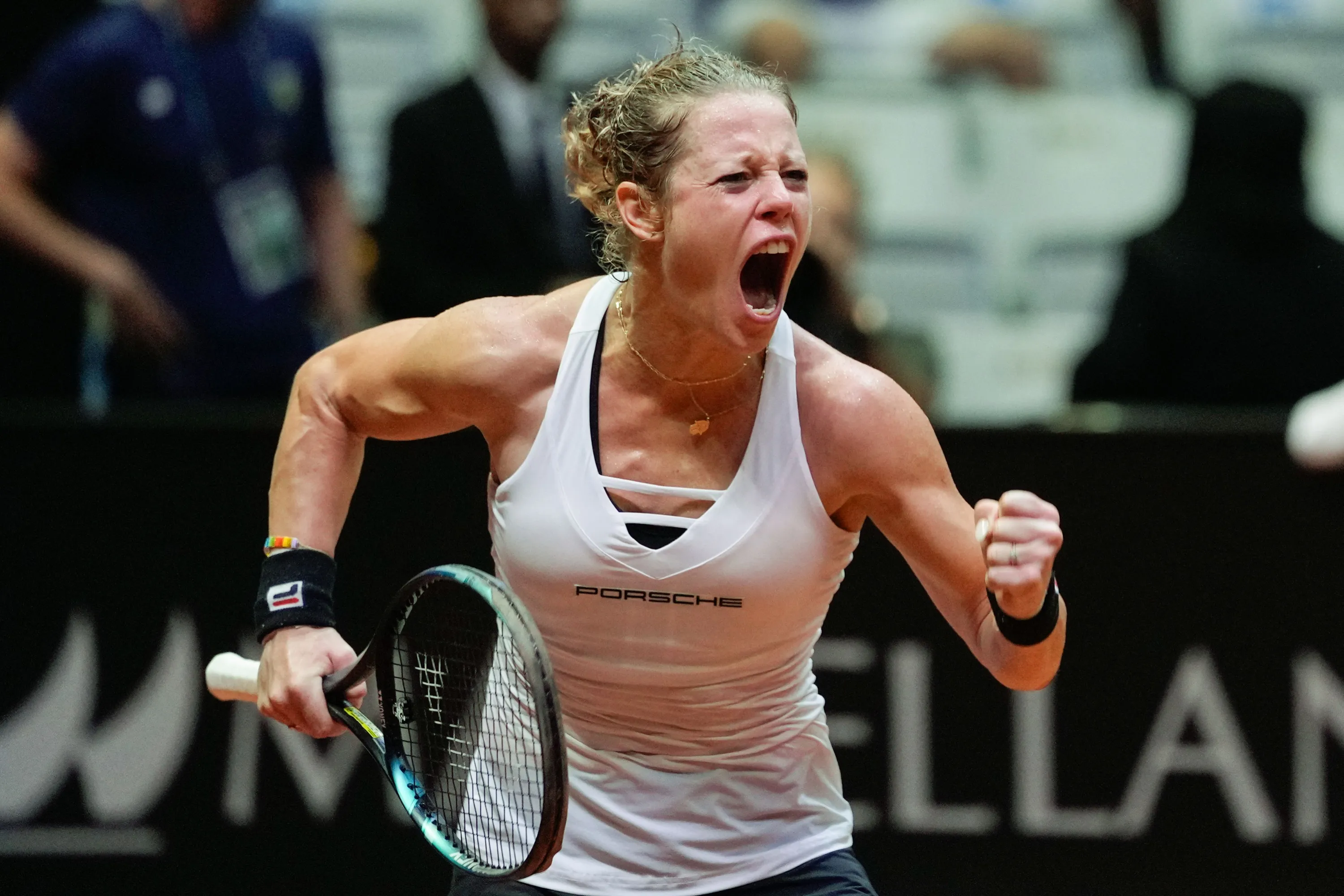 Laura Siegemund of Germany celebrates after defeating Carolina Alves of Brazil during their Billie Jean King Cup tennis match in Sao Paulo, Brazil, Saturday, April 13, 2024. (Photo by Andre Penner/AP Photo)