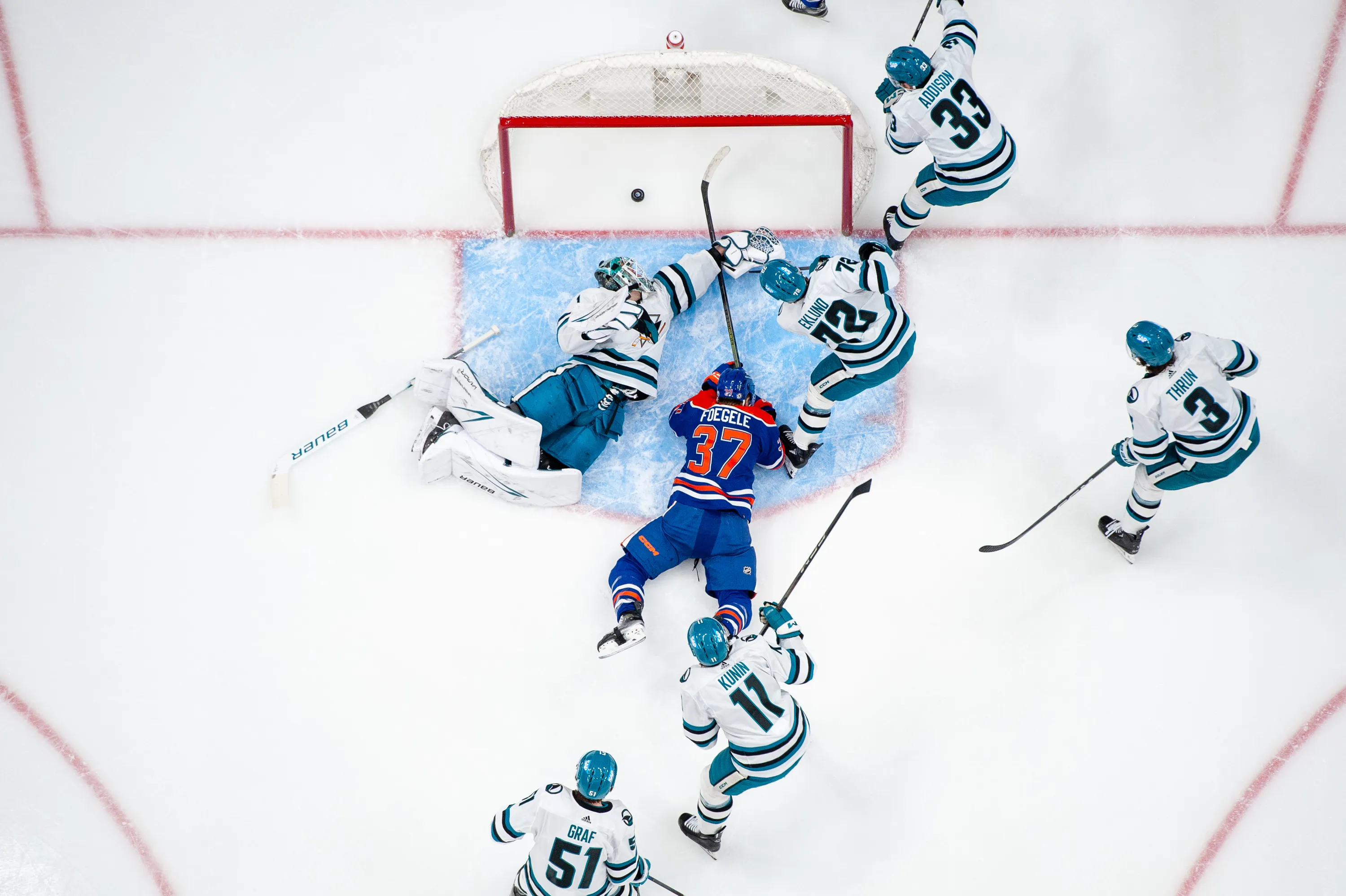 Warren Foegele #37 of the Edmonton Oilers scores a second-period goal against goaltender Devin Cooley #1 of the San Jose Sharks at Rogers Place on April 15, 2024, in Edmonton, Alberta, Canada. (Photo by Leila Devlin/Getty Images)