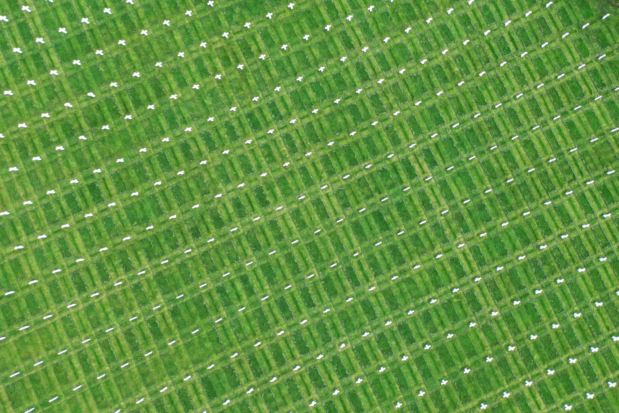 This aerial photograph taken on March 14, 2024, shows a view of the graves at the American Cemetery of Colleville-sur-Mer, northwestern France, during a media tour organised by the American Battle Monuments Commission (ABMC). June 6th, 2024 will mark the 80th anniversary of the Allied D-Day landings on the beaches of Normandy, which many considered to be the beginning of the end of World War II in Europe. (Photo by Lou Benoist/AFP Photo)