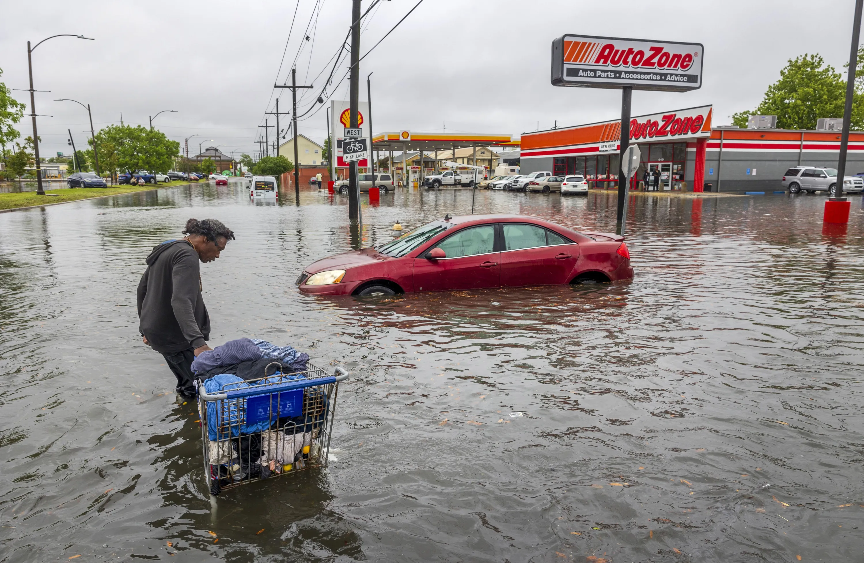 People carry their belongings down a flooded Broad Street in New Orleans, during a severe rainstorm on Wednesday, April 10, 2024. (Photo by Chris Granger/The Times-Picayune/The New Orleans Advocate via AP Photo)