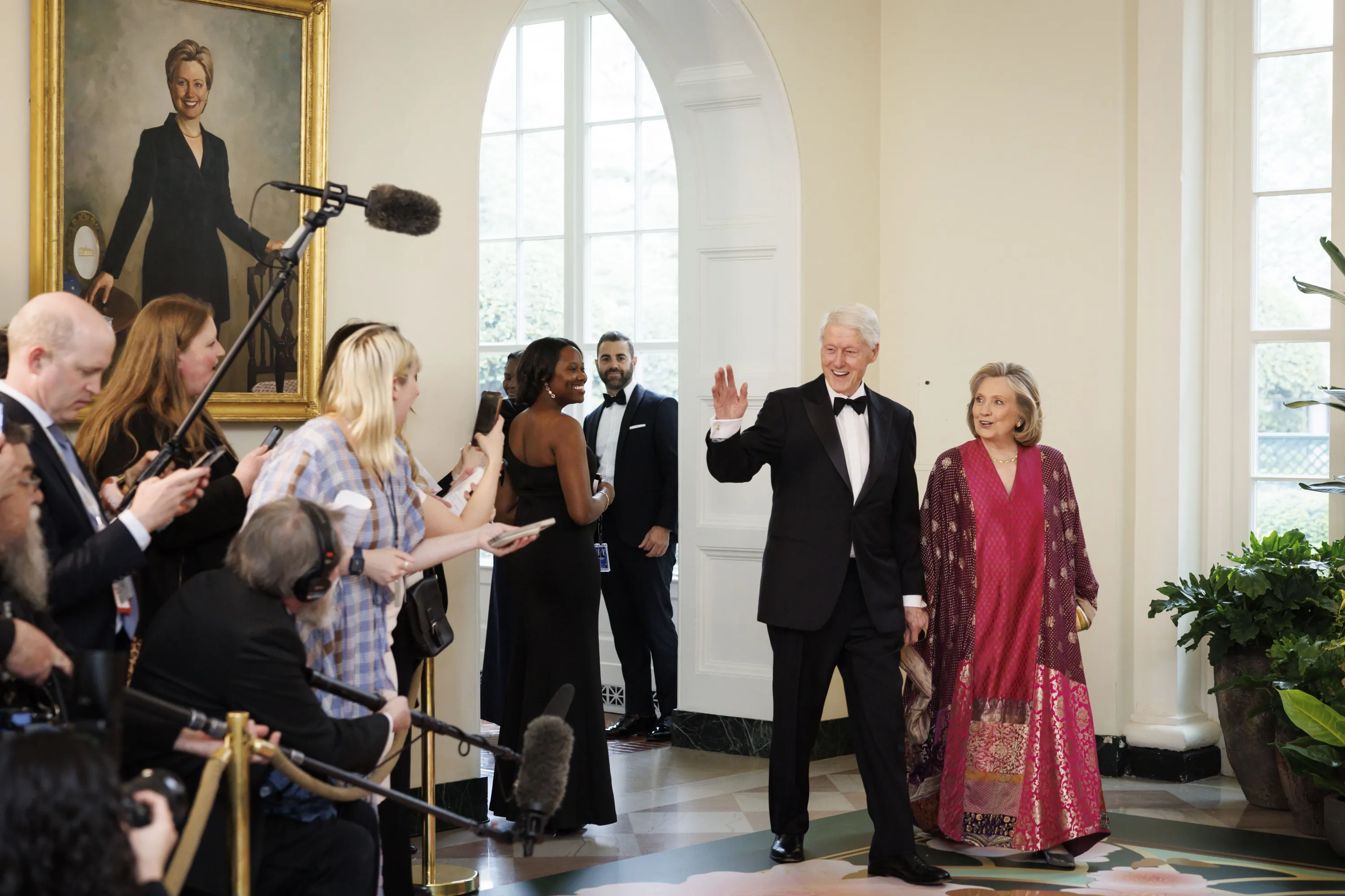 Former US President Bill Clinton, and former Secretary of State Hillary Rodham Clinton, arrive to attend a state dinner in honor of Japanese Prime Minister Kishida Fumio hosted by US President Joe Biden and First Lady Jill Biden at the White House in Washington on April 10, 2024. (Photo by Ting Shen/UPI/Rex Features/Shutterstock)
