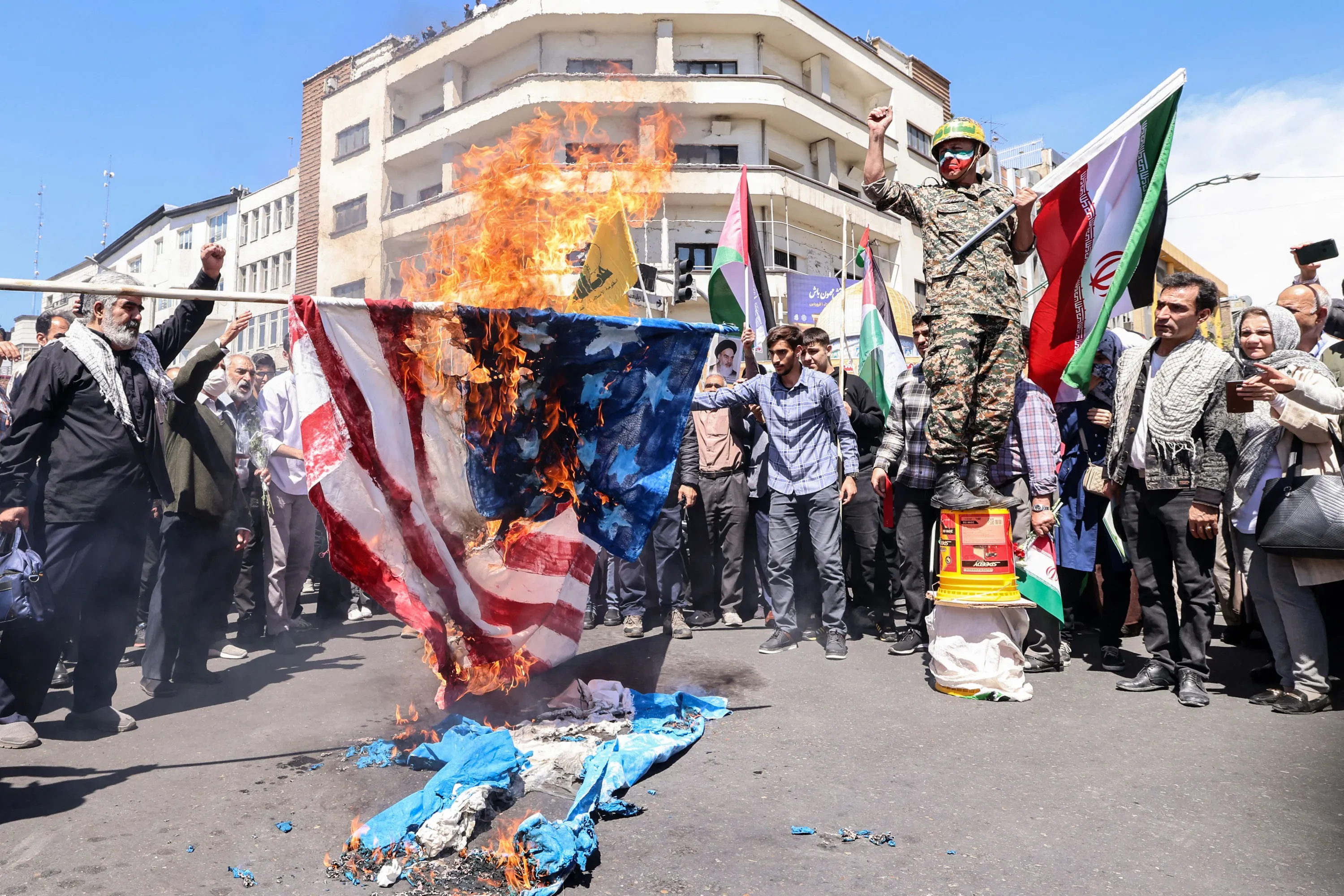 Iranians burn US and Israeli flags during the annual Quds (Jerusalem) Day commemorations and the funeral of seven Revolutionary Guard Corps members killed in a strike on the country's consular annex in Damascus, which Tehran blamed on Israel, on April 5, 2024 in Tehran. The Guards, including two generals, were killed in the air strike on April 1, which levelled the Iranian embassy's consular annex in Damascus. The funeral ceremony coincides with the annual Quds (Jerusalem) Day commemorations, when Iran and its allies stage marches in support of the Palestinians. (Photo by Atta Kenare/AFP Photo)