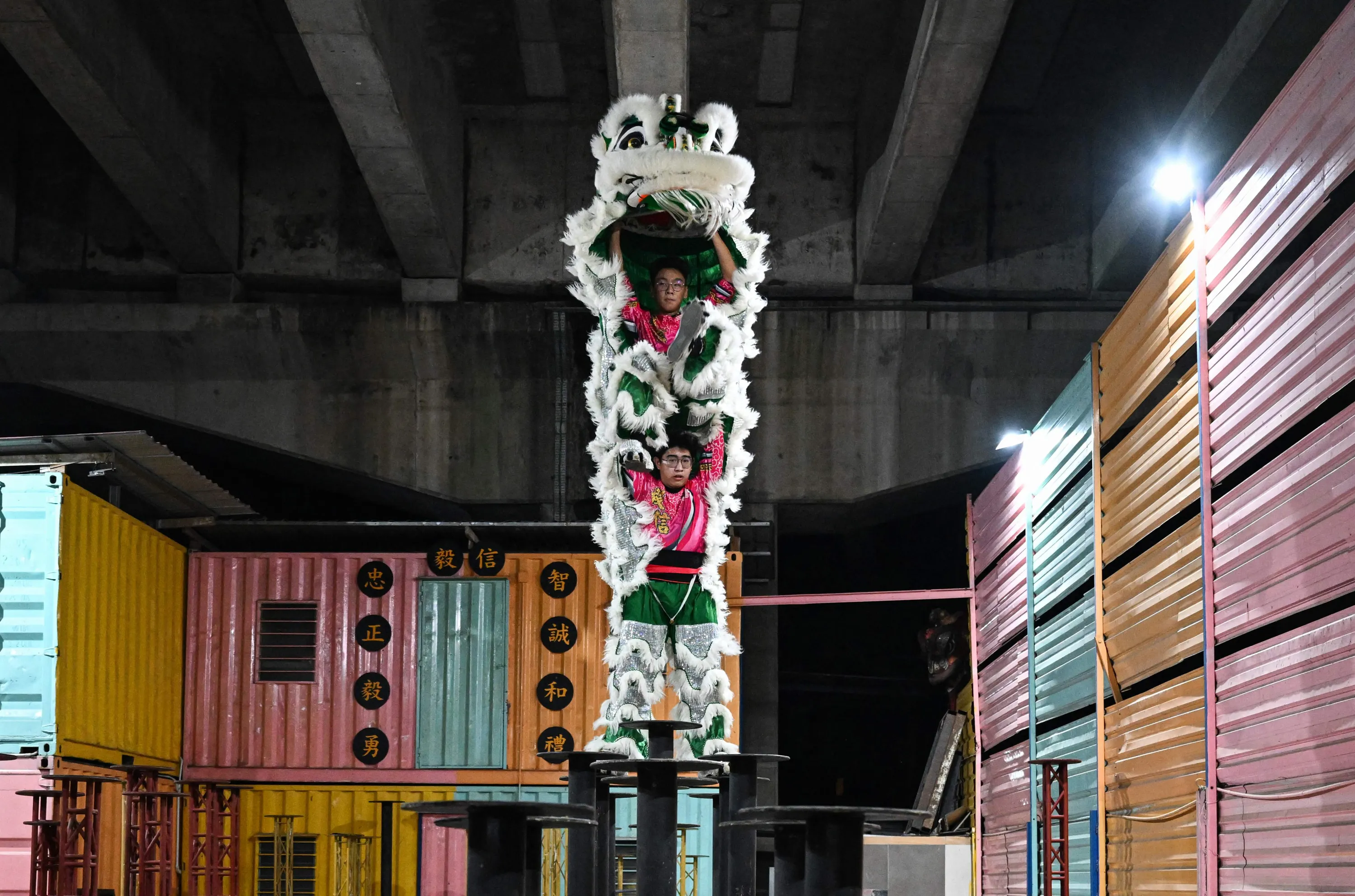 This picture taken on January 11, 2023 shows members of a lion dance troupe practising on high poles ahead of celebrations for the Lunar New Year of the Rabbit in Kuala Lumpur. (Photo by Mohd Rasfan/AFP Photo)