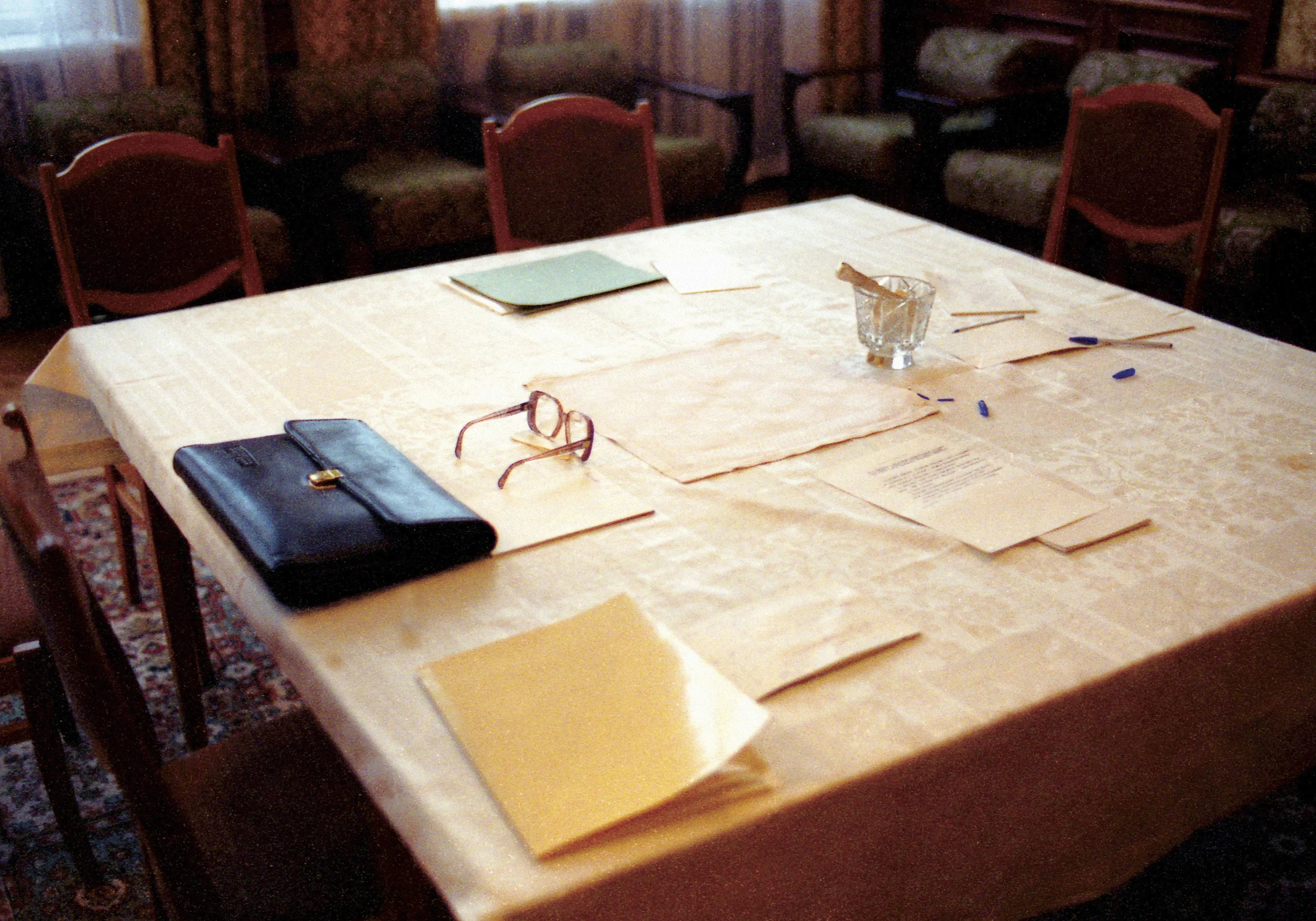 A table with some documents and glasses are seen after the signing of an agreement terminating the Soviet Union and declaring the creation of the Commonwealth of Independent States in Viskuli, Belarus, on December 8, 1991. The agreement by the leaders of the Soviet republics of Russia, Ukraine and Belarus dealt the final, deadly blow to the USSR. (Photo by Yuri Ivanov/AP Photo/File)