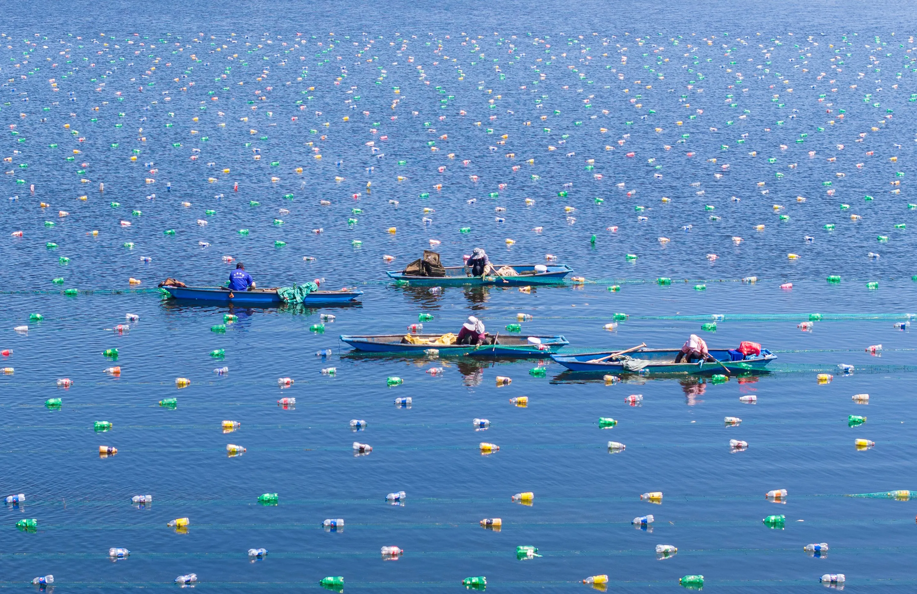 Workers are releasing newly grafted pearl mussels into a pearl breeding net at a reservoir in Suqian, Jiangsu province, China, on April 8, 2024. (Photo by Costfoto/NurPhoto/Rex Features/Shutterstock)