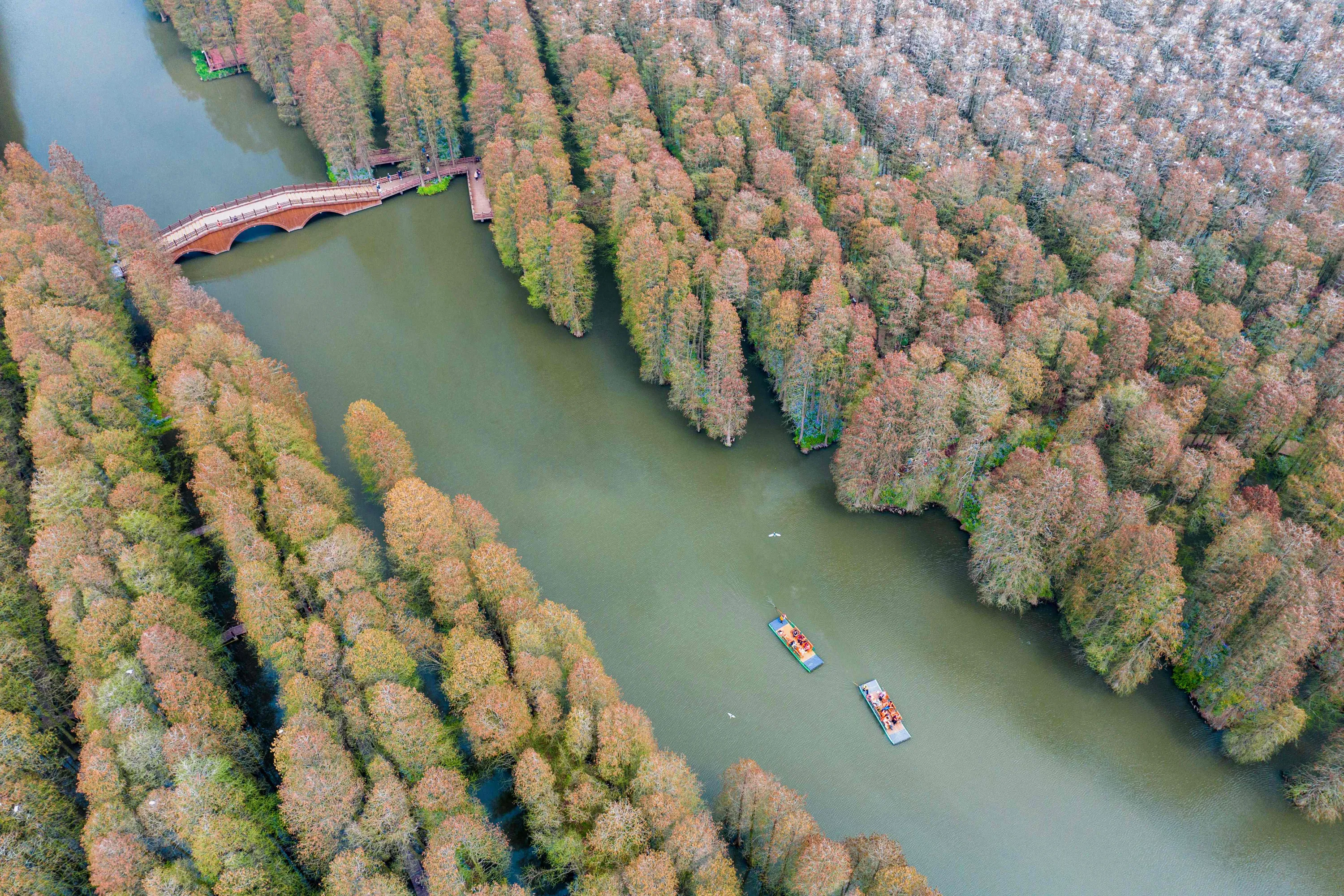 An aerial view shows people riding on boats at a wetland park in Xinghua, in eastern China's Jiangsu province on April 11, 2024. (Photo by AFP Photo/China Stringer Network)