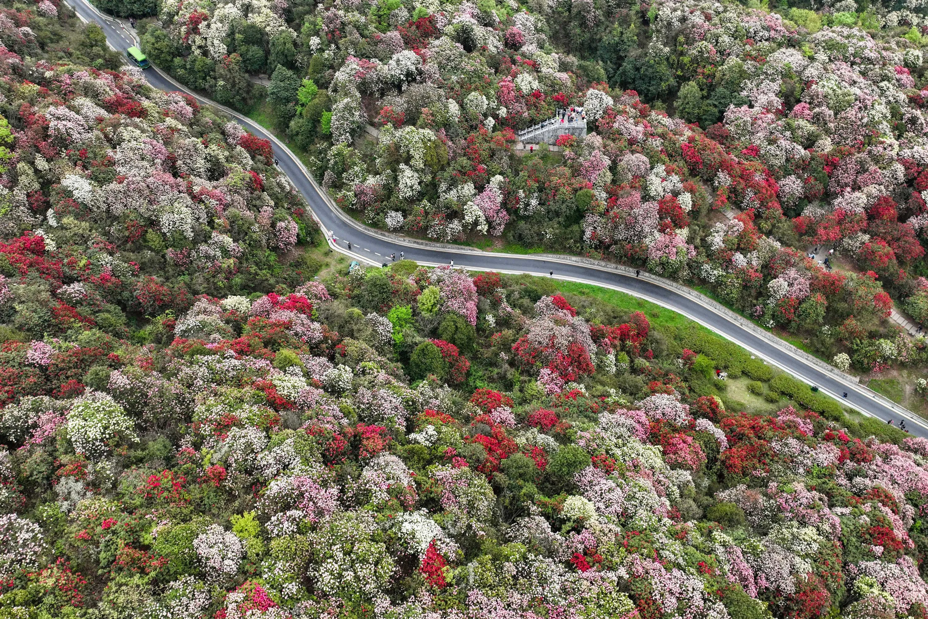 This aerial photo taken on April 11, 2024 shows visitors enjoying azaleas in full bloom at a forest park in Bijie, in China's southwestern Guizhou province. (Photo by AFP Photo/China Stringer Network)