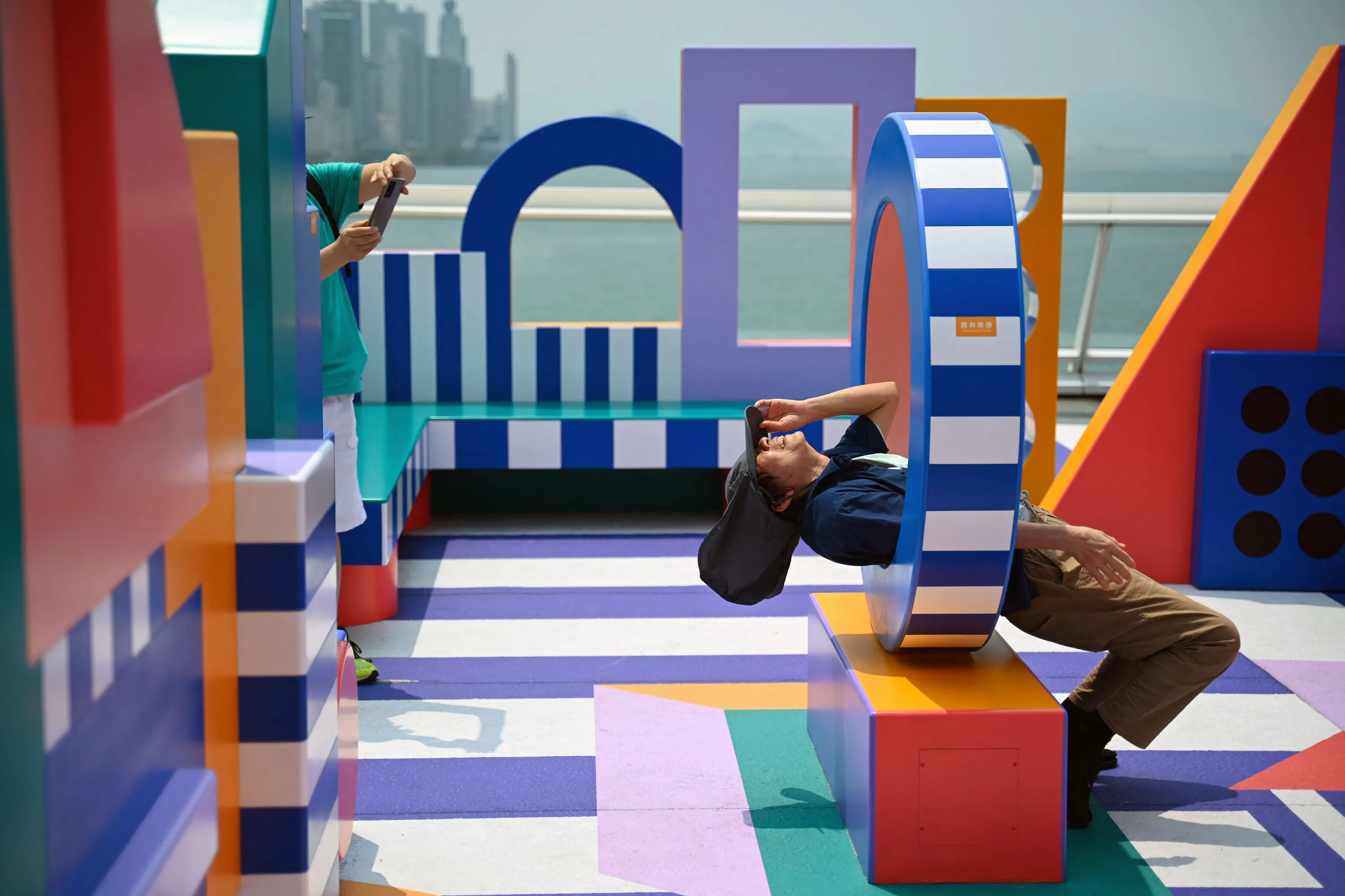 A visitor poses on an installation by French artist Camille Walala for “Planet Walala@Harbour City”, a public art show that is also an outdoor maze, in Hong Kong on April 12, 2024. (Photo by Peter Parks/AFP Photo)