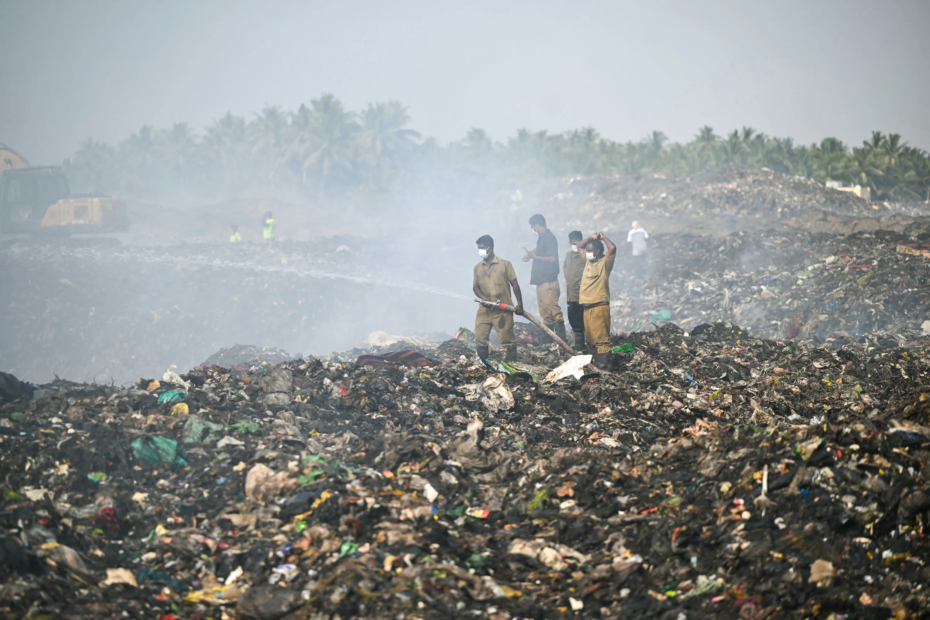 Workers douse a fire at Vellalore dump yard in Coimbatore on April 12, 2024. (Photo by R.Satish Babu/AFP Photo)