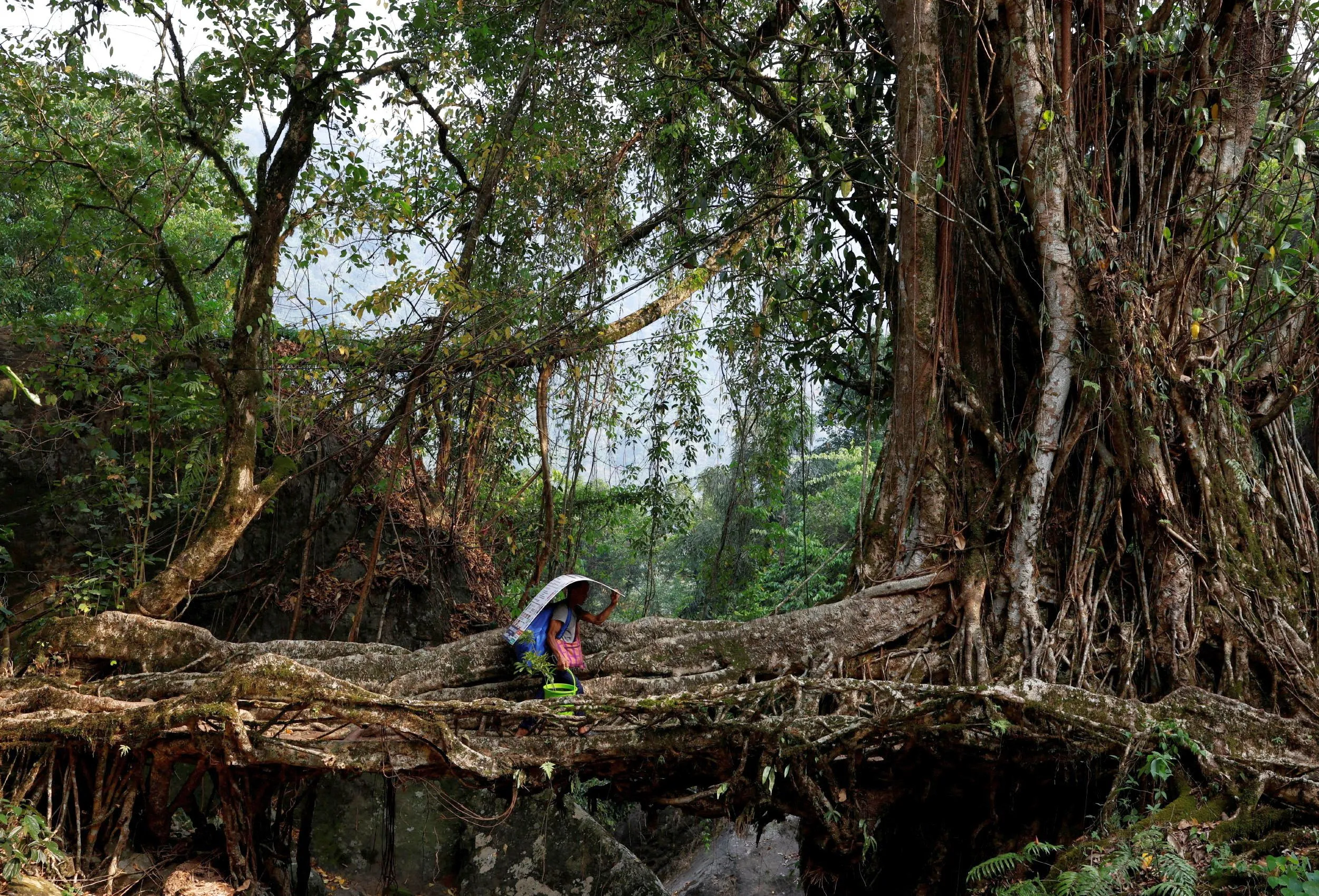 Stanley Mawa, 57, a porter, carries election material as he crosses a root bridge to reach a remote polling station, ahead of the first phase of the election, in Shillong in the northeastern state of Meghalaya, India, on April 17, 2024. (Photo by Adnan Abidi/Reuters)