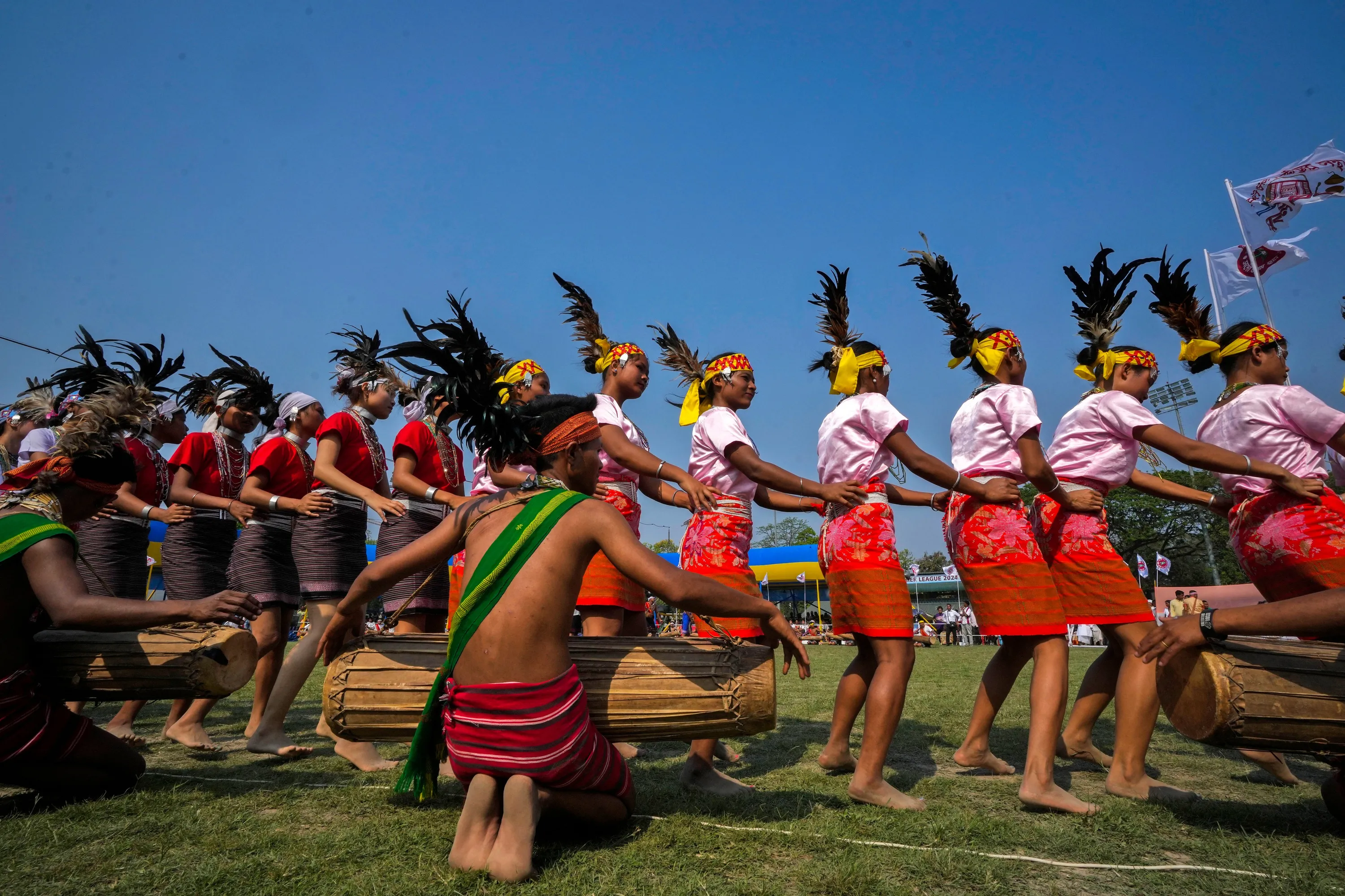 Girls from the Garo tribe perform a traditional Wangala dance during the Rongali Bihu festival, organized by All Assam Students Union in Guwahati, capital of the north eastern state of Assam, India, Saturday, April 13, 2024. The festival celebrates the arrival of spring and marks the beginning of the Assamese New Year. (Photo by Anupam Nath/AP Photo)