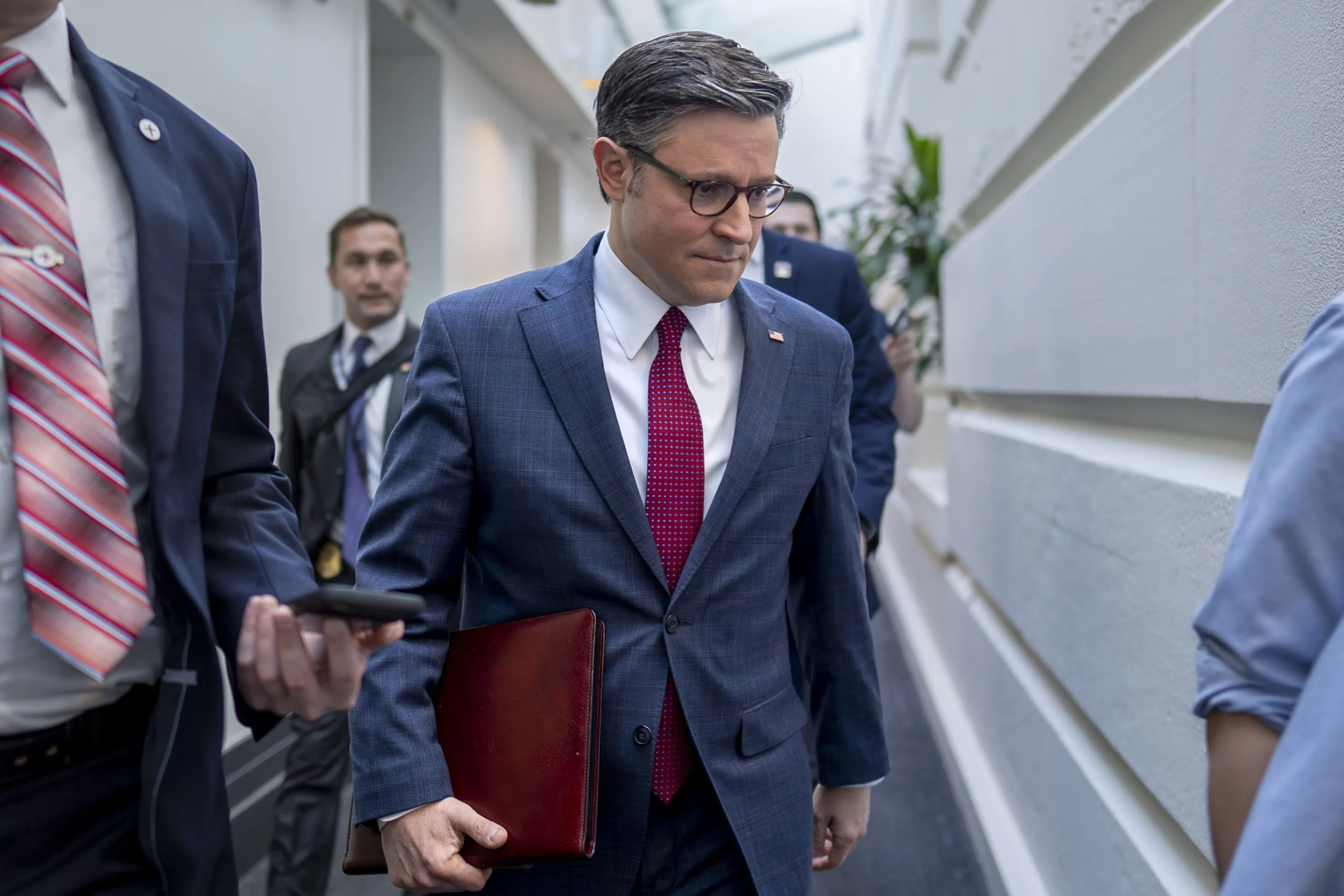 Speaker of the House Mike Johnson, R-La., and the House Republican leadership head to a closed-door Republican strategy session as Johnson pushes towards separate votes on aid for Israel and Ukraine, at the Capitol in Washington, Tuesday, April 16, 2024. (Photo by J. Scott Applewhite/AP Photo)