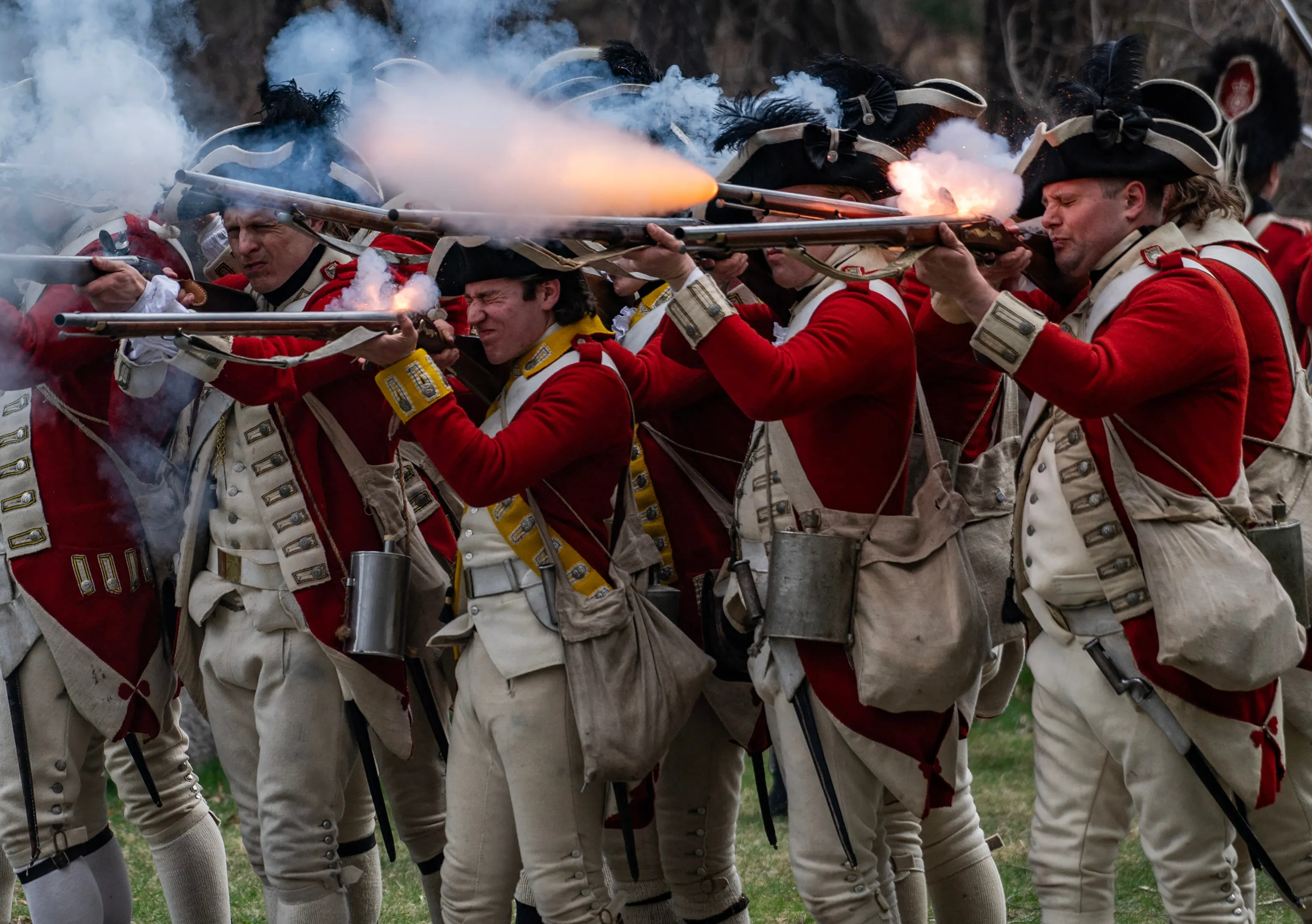 British regulars re-enactors fire a salvo at Colonial militia re-enactors as they take part in the Battle Road at Minute Man National Historical Park in Lincoln, Massachusetts, on April 13, 2024. The event marks the battle that immediately followed the Battle of Lexington and Concord on April 19, 1775, at the start of the US Revolutionary War. (Photo by Joseph Prezioso/AFP Photo)