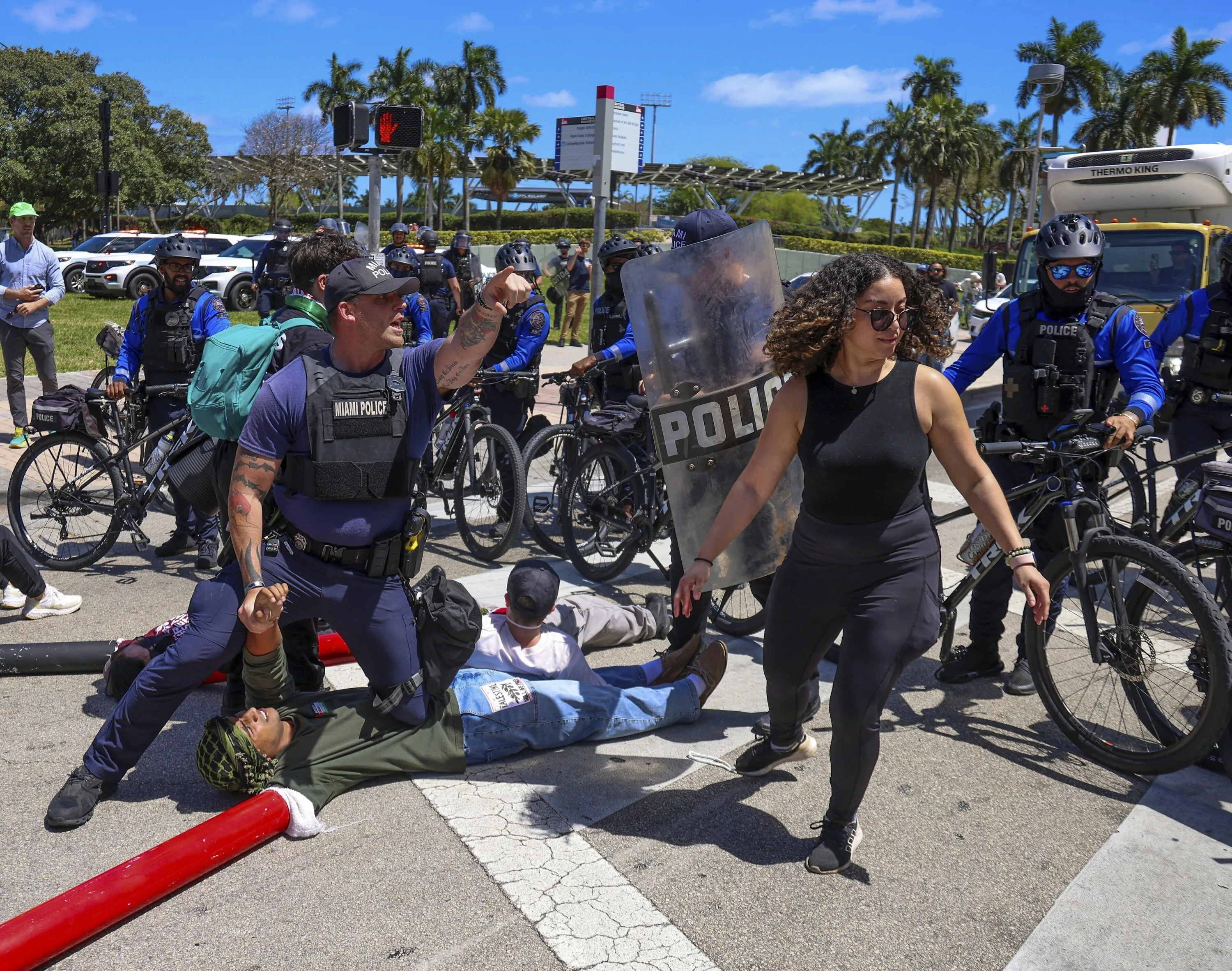 Protesters for a cease-fire in support of Gaza lie down in the intersection of NE 3rd Street and northbound Biscayne Boulevard and were later arrested by Miami Police, Monday, April 15, 2024, in downtown Miami. (Photo by Carl Juste/Miami Herald via AP Photo)