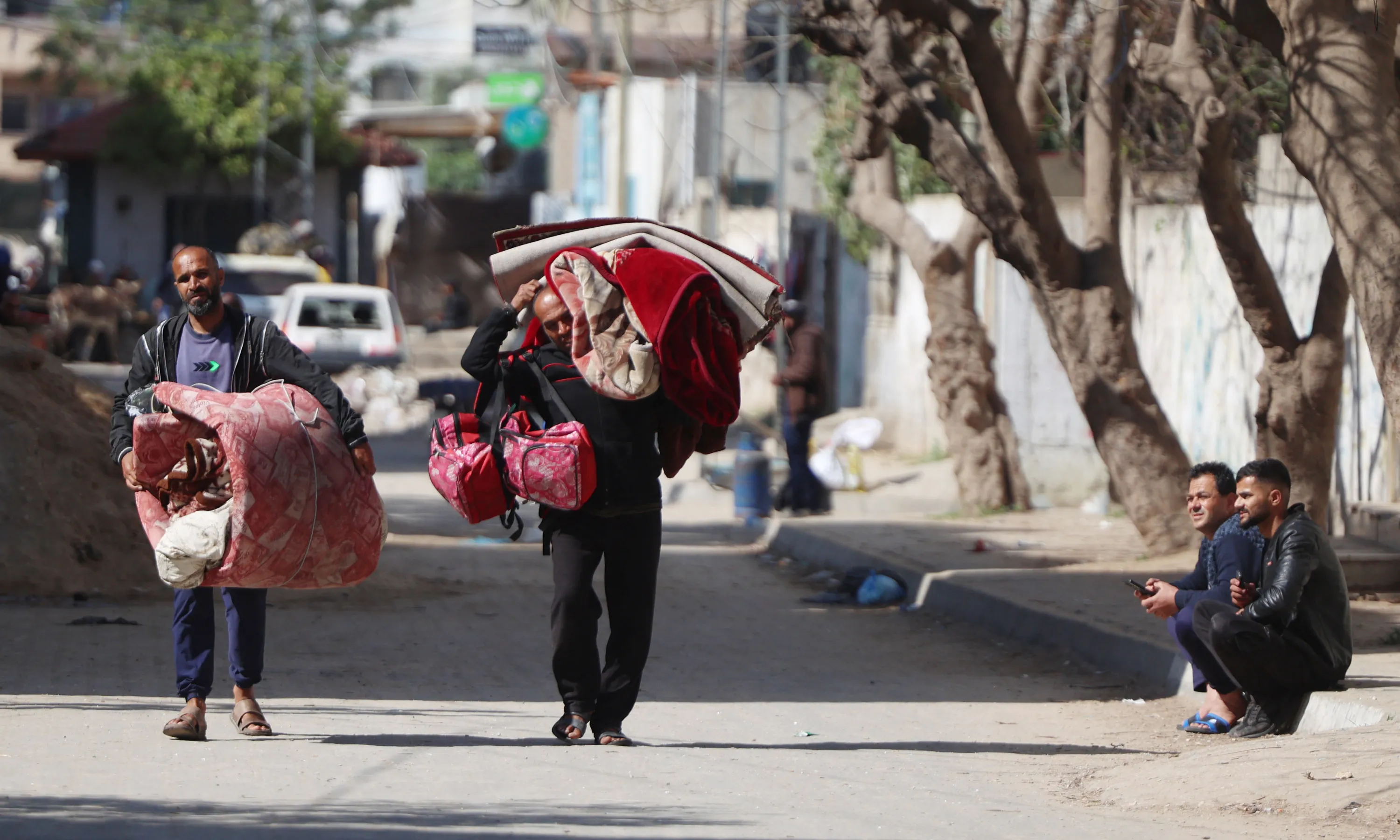 Palestinians leave their homes with their belongings in the Nuseirat refugee camp in central Gaza on April 12, 2024, amid the ongoing conflict between Israel and the Palestinian militant group Hamas. (Photo by AFP Photo/Stringer)