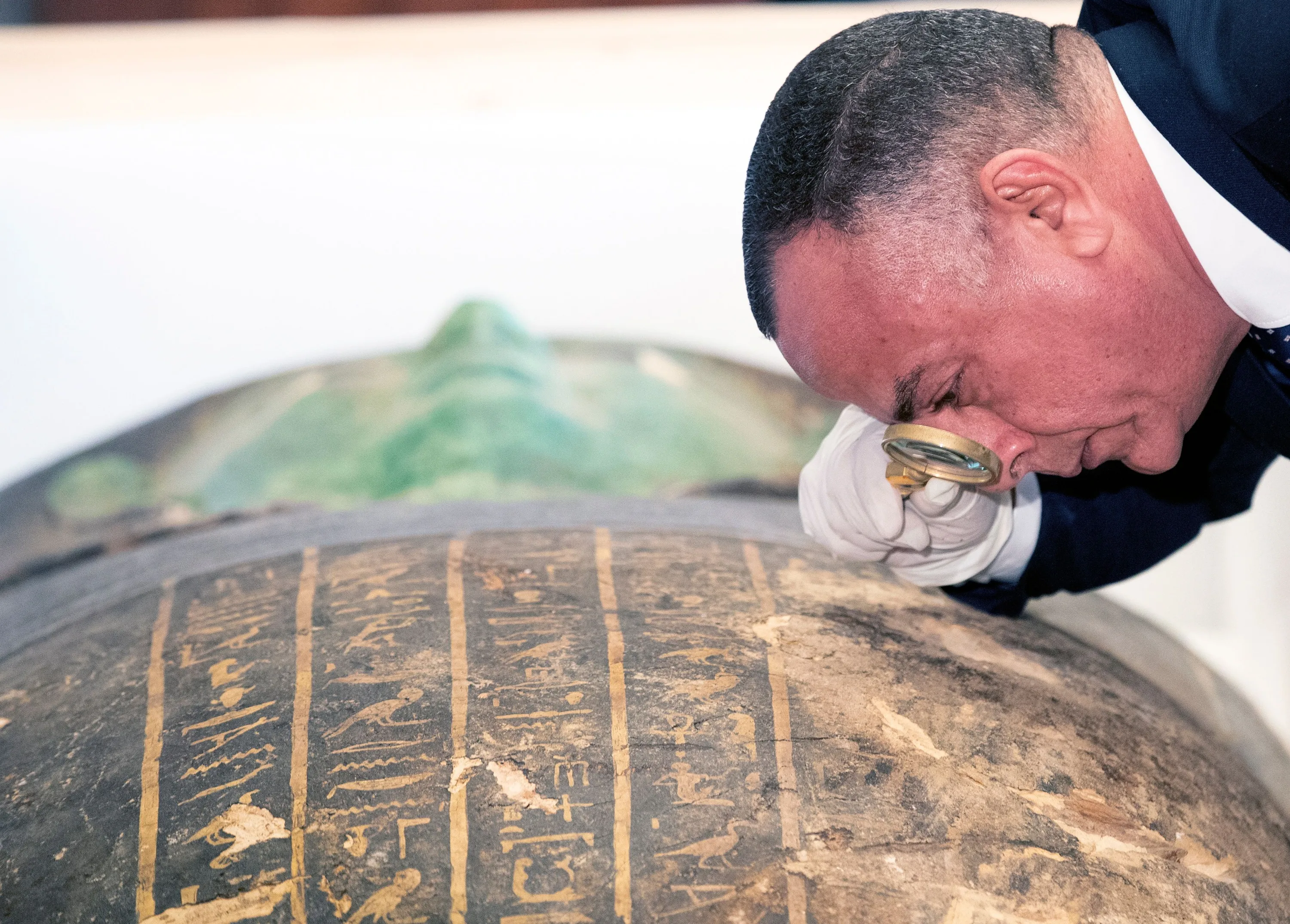 Secretary-General of the Egyptian Supreme Council of Antiquities Mostafa Waziri takes a close look at the ancient Egyptian artefact “Green Sarcophagus” after it was returned from the Houston Museum of Natural Sciences, in Cairo, Egypt, 02 January 2023. Egyptian Foreign Minister Sameh Shoukry and US Charge of Affairs Daniel Rubinstein attended a ceremony on 02 January to celebrate the handing over of the coffin lid known as the “Green Sarcophagus” that was smuggled illegally outside of Egypt and recovered from the Houston Museum of Natural Sciences. The artefact is three meters long carved in wood with columns of hieroglyphic texts dating back to the Late Period (664-332 BC). (Photo by Khaled Elfiqi/EPA/EFE/Rex Features/Shutterstock)