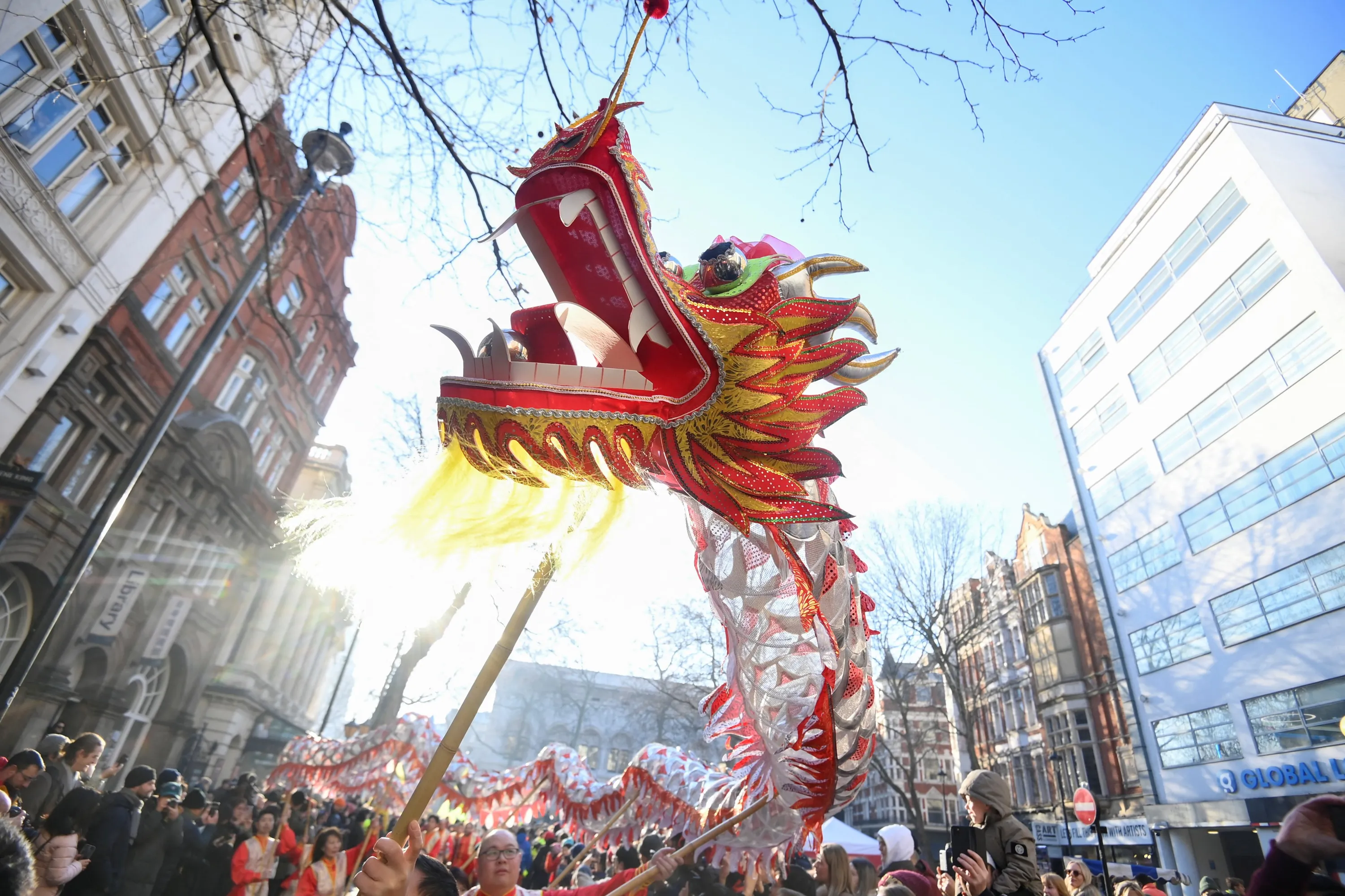 People march through a street during celebrations on the first day of the Lunar New Year in London, Britain on January 22, 2023. (Photo by Toby Melville/Reuters)