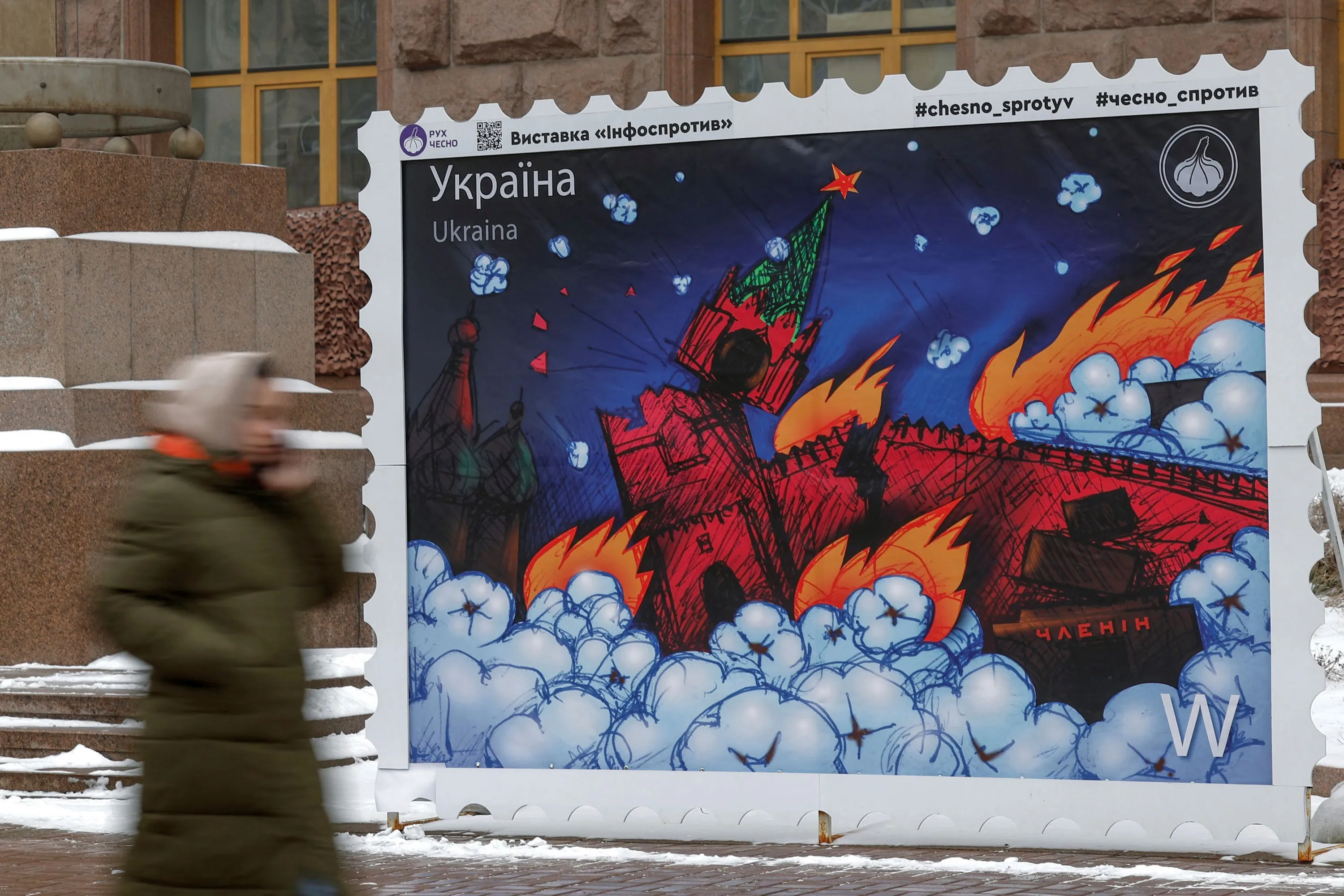A woman walks past a giant mock-up of a postal stamp depicting a burning Moscow Kremlin, amid Russia's attack on Ukraine, in Kyiv, Ukraine on January 12, 2023. (Photo by Valentyn Ogirenko/Reuters)