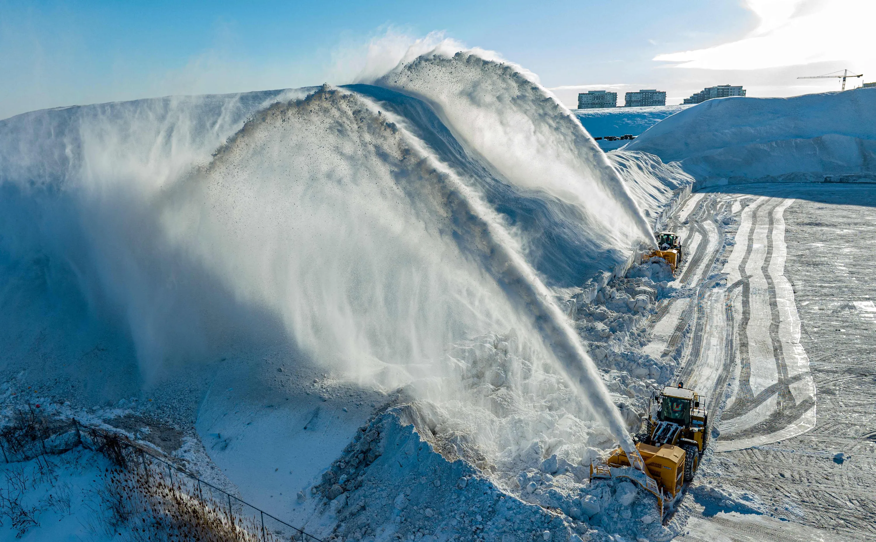 Aerial picture of snow removal operation in Montreal, Quebec, Canada, on January 27, 2023. Dump of snow – in just a few hours, tons of snow is removed from roadways to allow cars, bicycles and pedestrians to get around the island city – an enormous logistical effort with significant environmental costs, including impacts of road salt and emissions from these hundreds of the snow-clearing vehicles put into action an average of 100 days or more each year. (Photo by Sébastien St-Jean/AFP Photo)