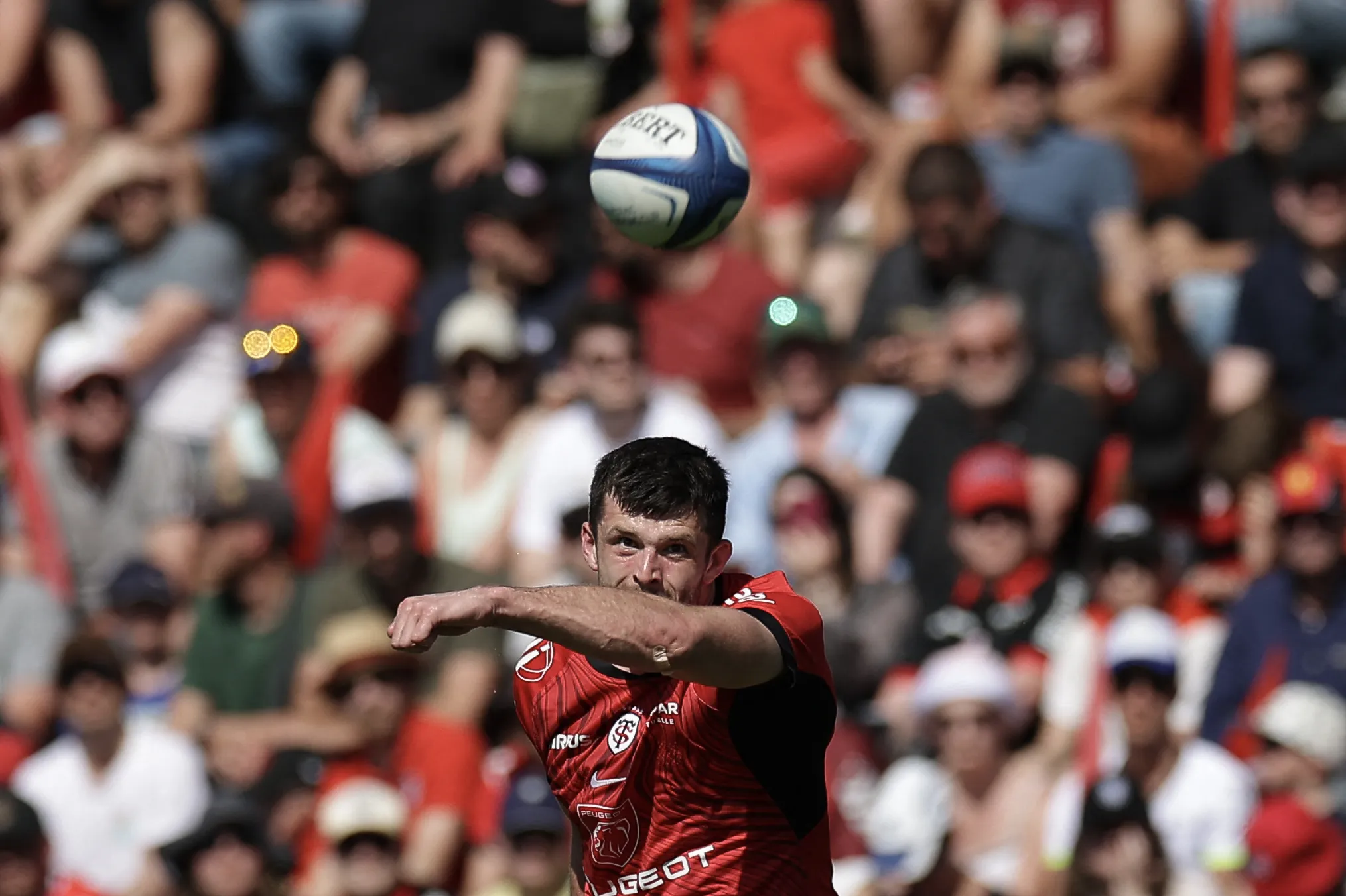 Toulouse's Scottish full-back Blair Kinghorn kicks the ball to convert a try during the European Rugby Champions Cup quarter-final rugby union match between Stade Toulousain Rugby (Toulouse) and Exeter Chiefs at the Ernest-Wallon stadium, in Toulouse, southwestern France, on April 14, 2024. (Photo by Valentine Chapuis/AFP Photo)
