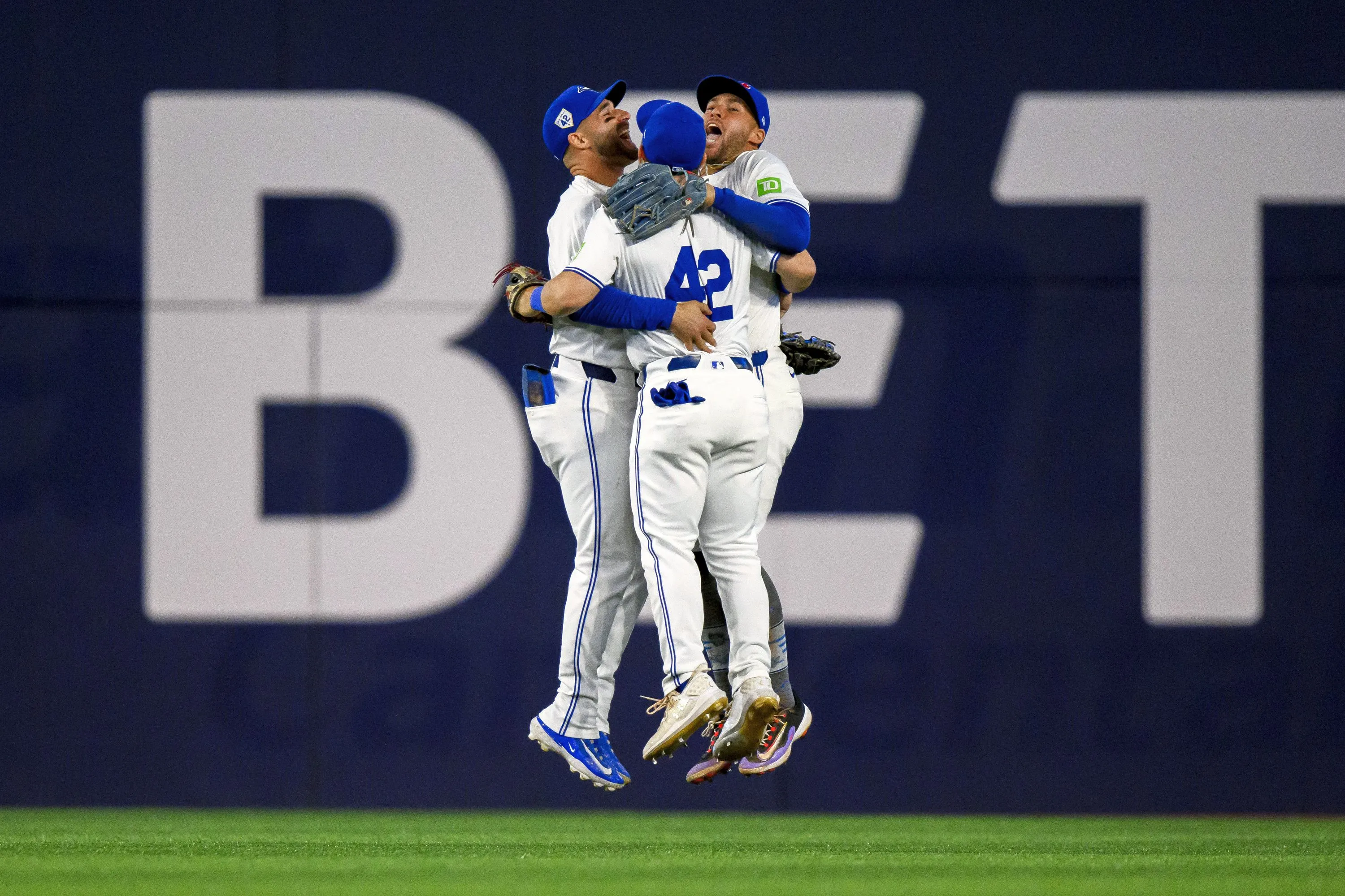 Toronto Blue Jays teammates Daulton Varsho, Kevin Kiermaier and George Springer celebrate after defeating the New York Yankees in a baseball game in Toronto on Monday, April 15, 2024. (Photo by Christopher Katsarov/The Canadian Press via AP Photo)