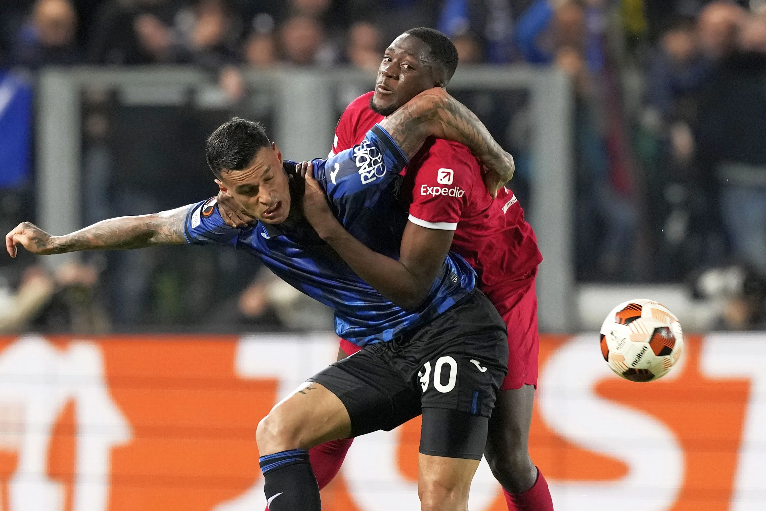Liverpool's Ibrahima Konate fights for the ball with Atalanta's Gianluca Scamacca, left, during the Europa League quarterfinal, second leg, soccer match between Atalanta and Liverpool at the Stadio di Bergamo, in Bergamo, Italy, Thursday, April 18, 2024. (Photo by Antonio Calanni/AP Photo)