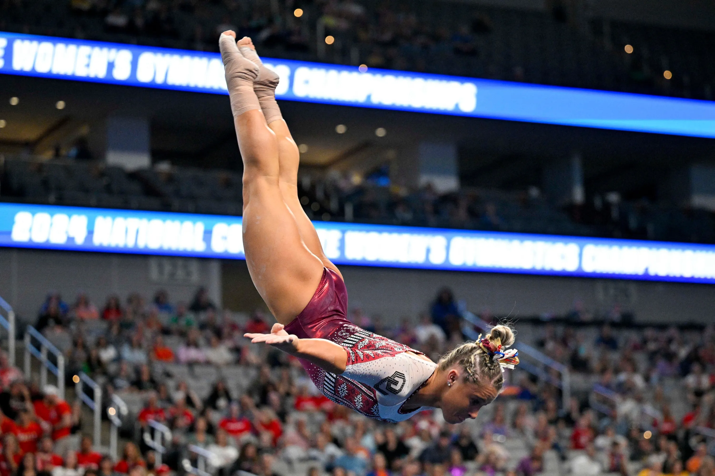 The University of Oklahoma gymnast Ragan Smith performs during the 2024 NCAA gymnastics semifinals at Dickies Arena, Texas on April 16, 2024 (Photo by Jerome Miron/USA TODAY Sports via Reuters)