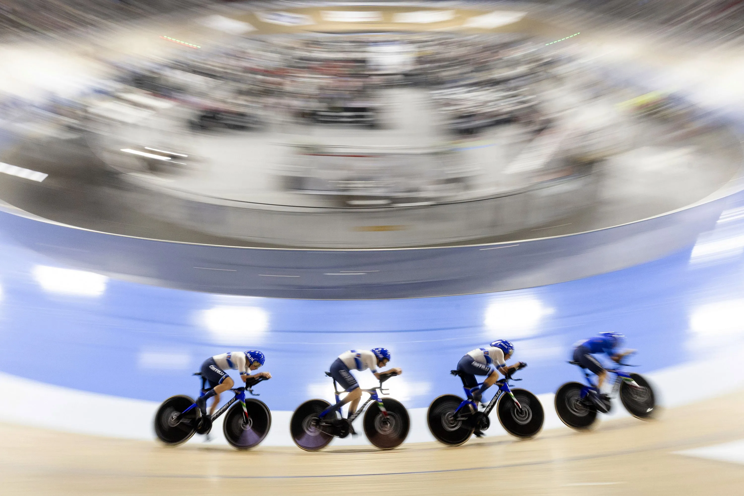 Elisa Balsamo, Chiara Consonni, Martina Fidanza and Vittoria Guazzini, of Italy, compete in the gold-medal round of the women's team pursuit during the UCI Track Nations Cup cycling event in Milton, Ontario, Friday, April 12, 2024. (Photo by Nick Iwanyshyn/The Canadian Press via AP Photo)